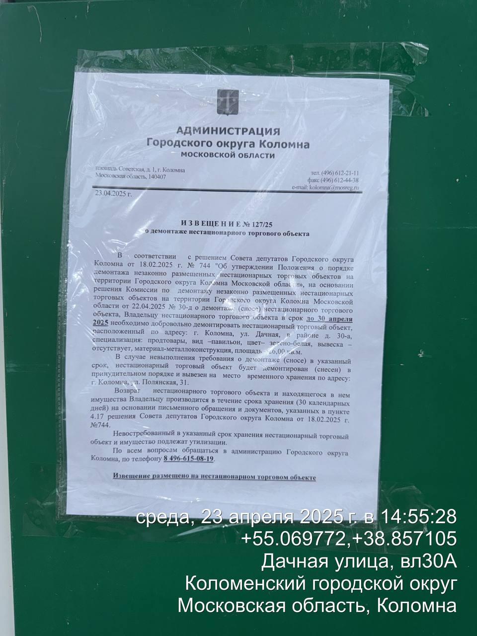 Извещение № 127/25 о демонтаже НТО по адресу: г. Коломна, ул. Дачная, в районе д. 30-а, специализация: продтовары, вид –павильон, цвет– зелено-белый, вывеска – отсутствует, материал-металлоконструкция, площадь - 26,00 кв.м.