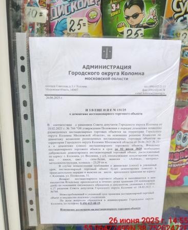 Извещение № 132/25 о демонтаже НТО по адресу: г. Коломна, ул. Ленина, у д.67-а, специализация: кондитерские изделия, вид –павильон, цвет– красный с белыми ролл ставнями, вывеска – отсутствует, материал-металлоконструкция, площадь – 26,00 кв.м.26 июнь 2025Извещение № 133/25 о демонтаже НТО по адресу: г. Коломна, ул. Филина, у д.2, специализация: кондитерские изделия, вид –павильон, цвет– красно-бежевый с белыми ролл ставнями, вывеска – «Сластёна», материал-металлоконструкция, площадь - 25,00 кв.м.26 июнь 2025Извещение № 12/22 о демонтаже нестационарного торгового объекта расположенного по адресу: г.Коломна, пересечение ул. Зеленая д.38 и ул. Калинина (ближе к д. 38), специализация: хлеб, хлебобулочные изделия (вывеска – свежий хлеб)15 ноябрь 2022Извещение № 5/22 о демонтаже нестационарного торгового объекта расположенного по адресу: г.Коломна, пл. Восстания у д. 4, специализация: не определена (нестационарный объект – закрыт, сверху вывеска овощи и фрукты), вид – павильон, цвет – серый15 ноябрь 2022Извещение № 9/22 о демонтаже нестационарного торгового объекта расположенного по адресу: г.Коломна, ул. Гаврилова в районе д. 2, специализация: не определена (нестационарный объект – закрыт, вывеска – свежее мясо), вид – павильон, цвет – серый15 ноябрь 2022