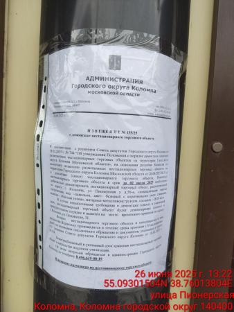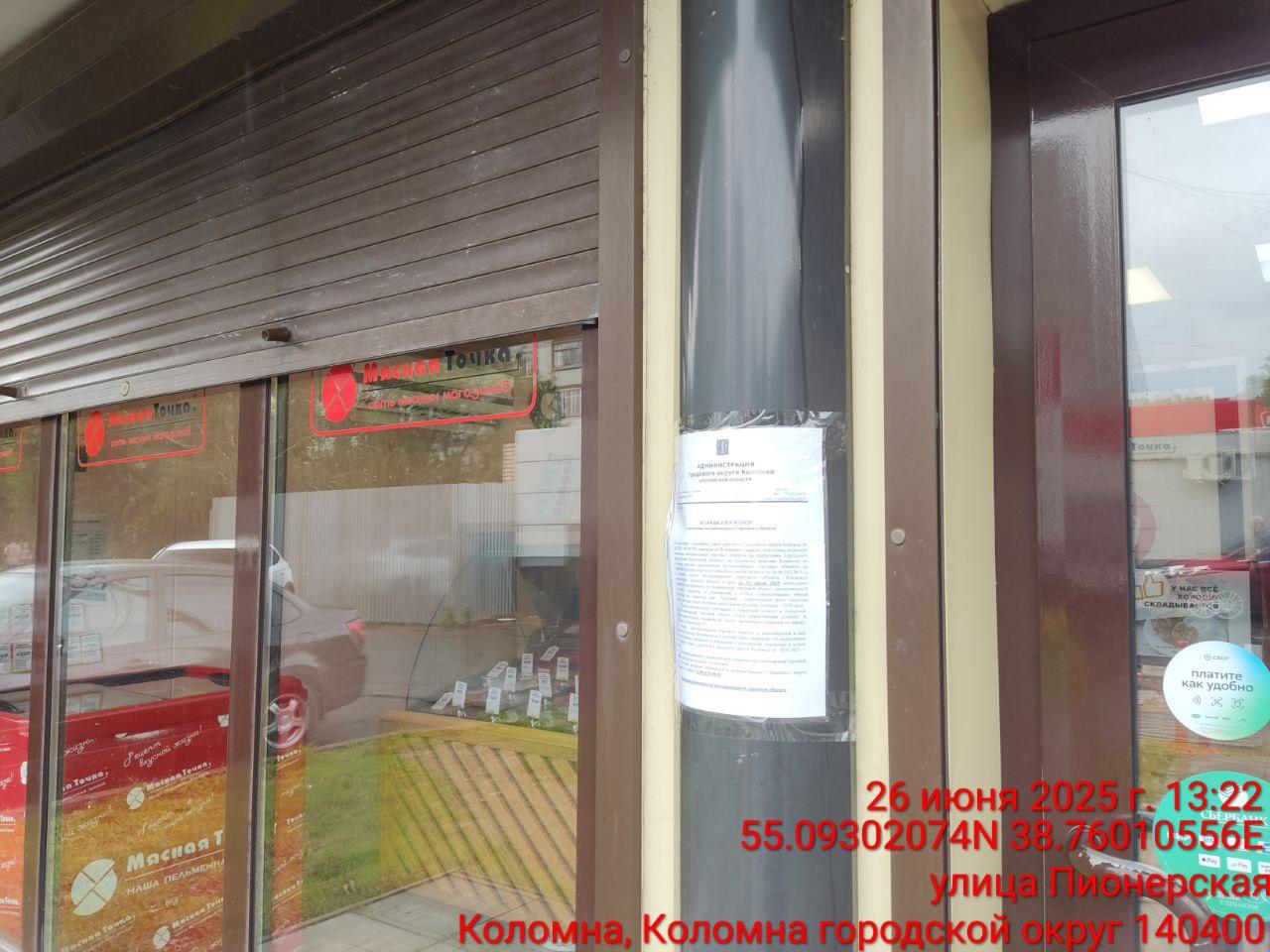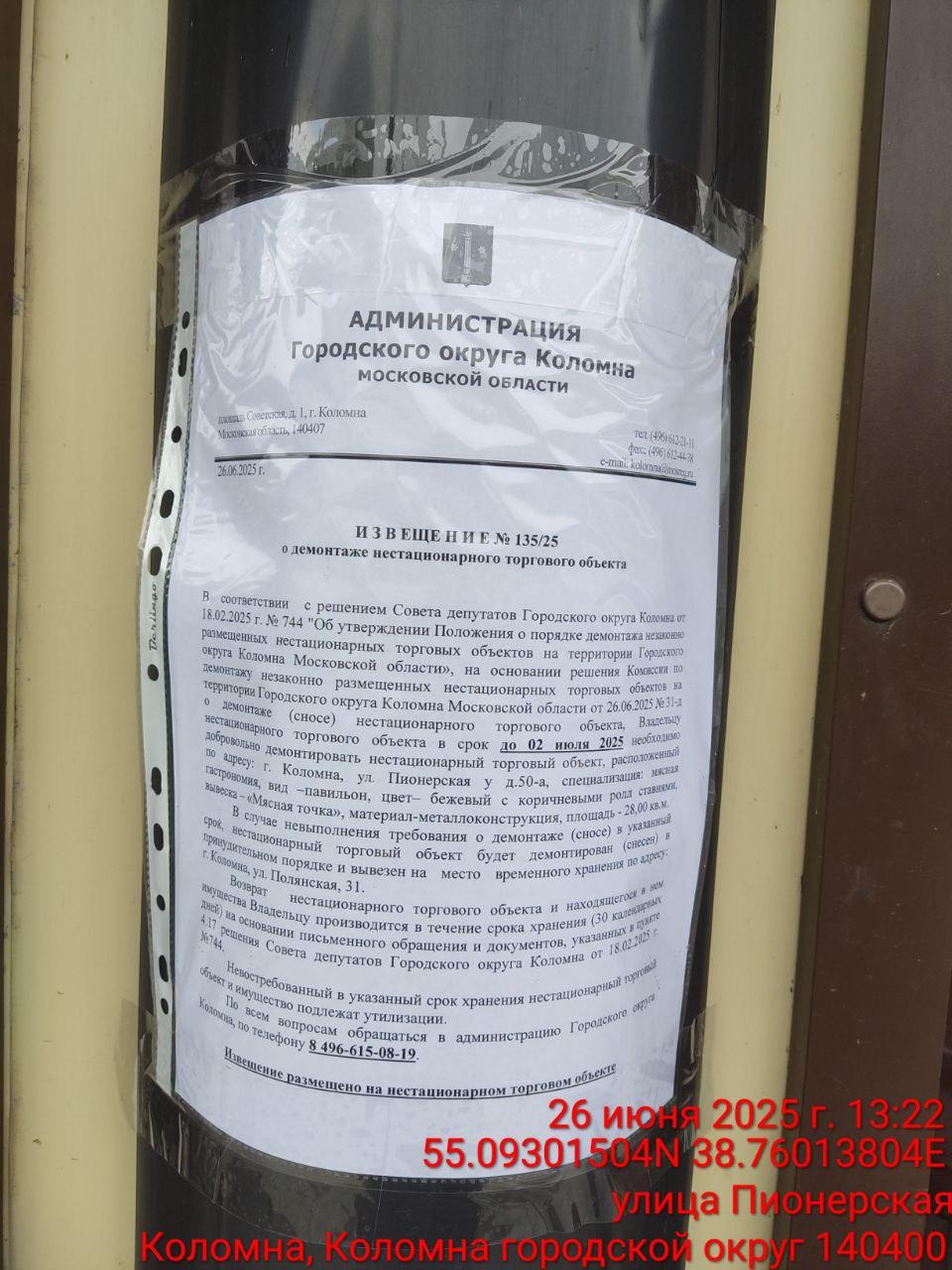 Извещение № 135/25 о демонтаже НТО по адресу: г. Коломна, ул. Пионерская у д.50-а, специализация: мясная гастрономия, вид –павильон, цвет– бежевый с коричневыми ролл ставнями, вывеска – «Мясная точка», материал-металлоконструкция, площадь-28,00 кв.м.