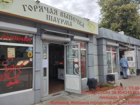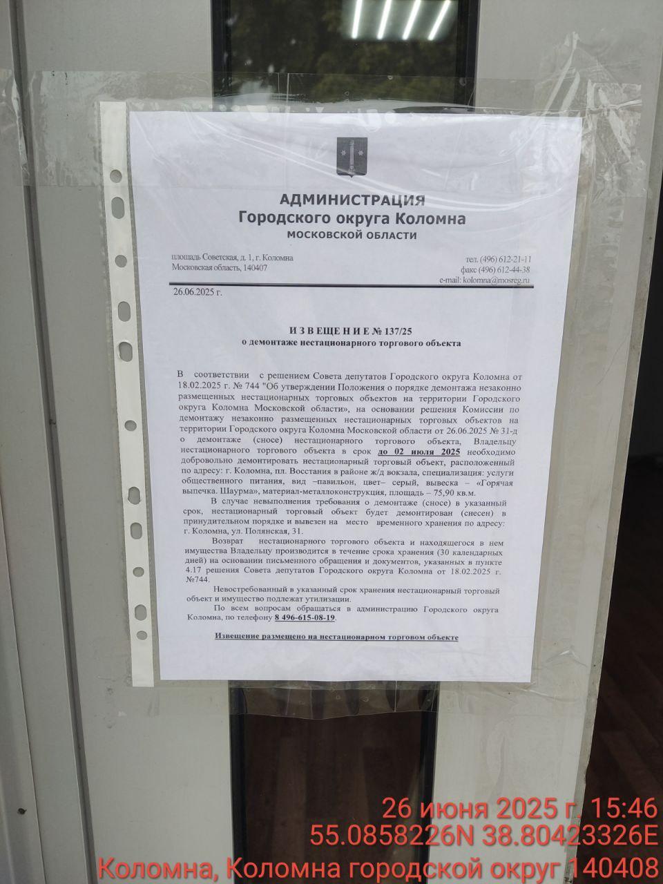 Извещение № 137/25 о демонтаже НТО по адресу: г. Коломна, пл. Восстания в районе ж/д вокзала, специализация: услуги общественного питания, вид –павильон, цвет– серый, вывеска–«Горячая выпечка. Шаурма», материал-металлоконструкция, площадь–75,90 кв.м.
