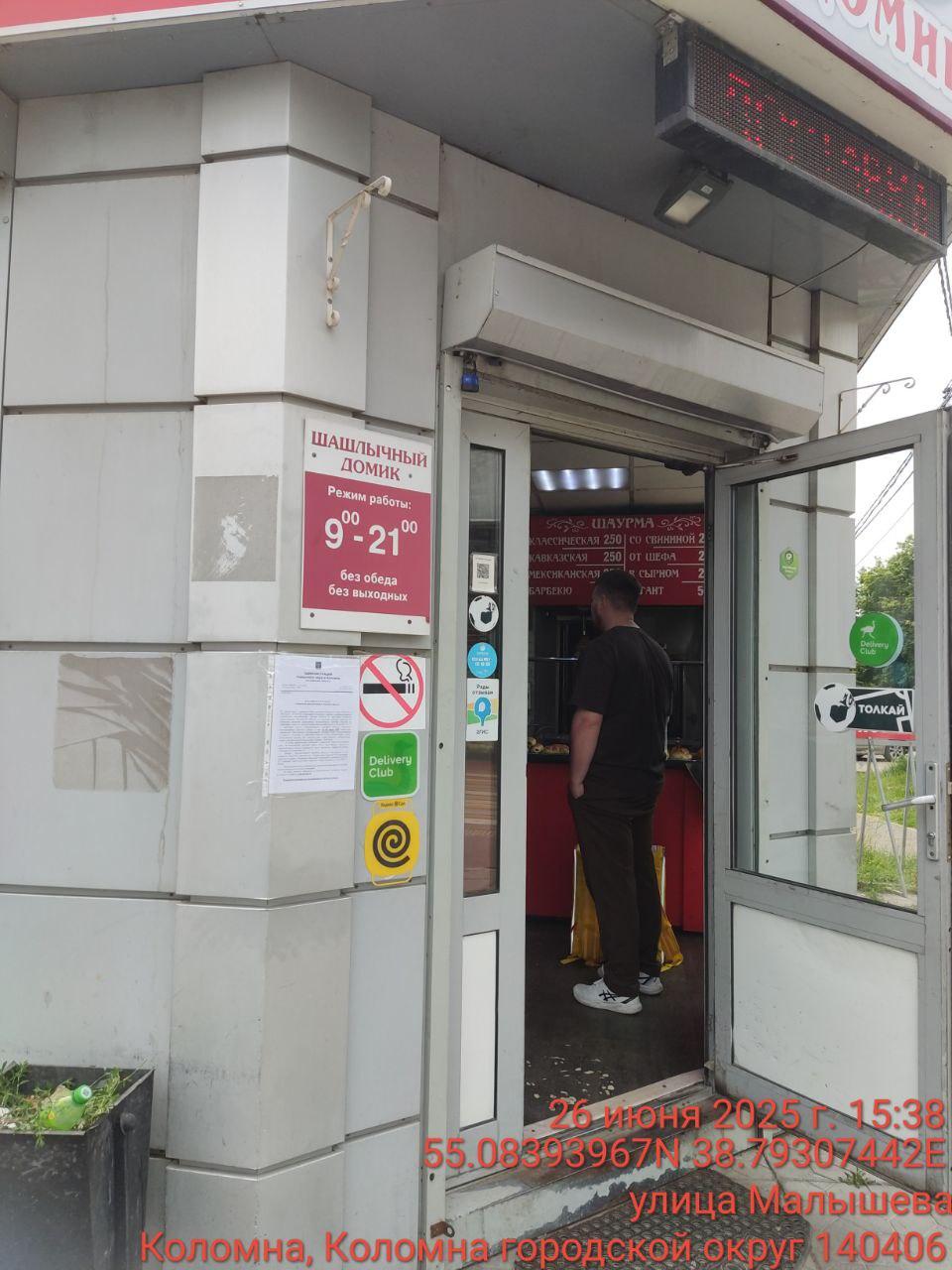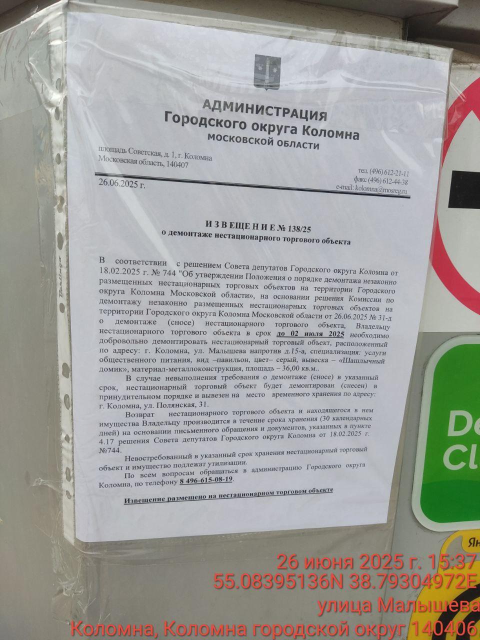 Извещение № 138/25 о демонтаже НТО по адресу: г. Коломна, ул. Малышева напротив д.15-а, специализация: услуги общественного питания, вид –павильон, цвет– серый, вывеска – «Шашлычный домик», материал-металлоконструкция, площадь – 36,00 кв.м.