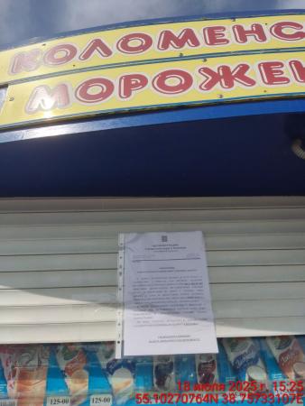Уведомление о демонтаже нестационарного торгового объекта по адресу: г.Коломна, ул.Зайцева, у д.44 (автост. "Старая Коломна"), в связи с расторжением договора №69 от 28.06.17. Специализация-мороженое, вид-киоск, цвет-синий, площ.-не более 8,20 кв.м.