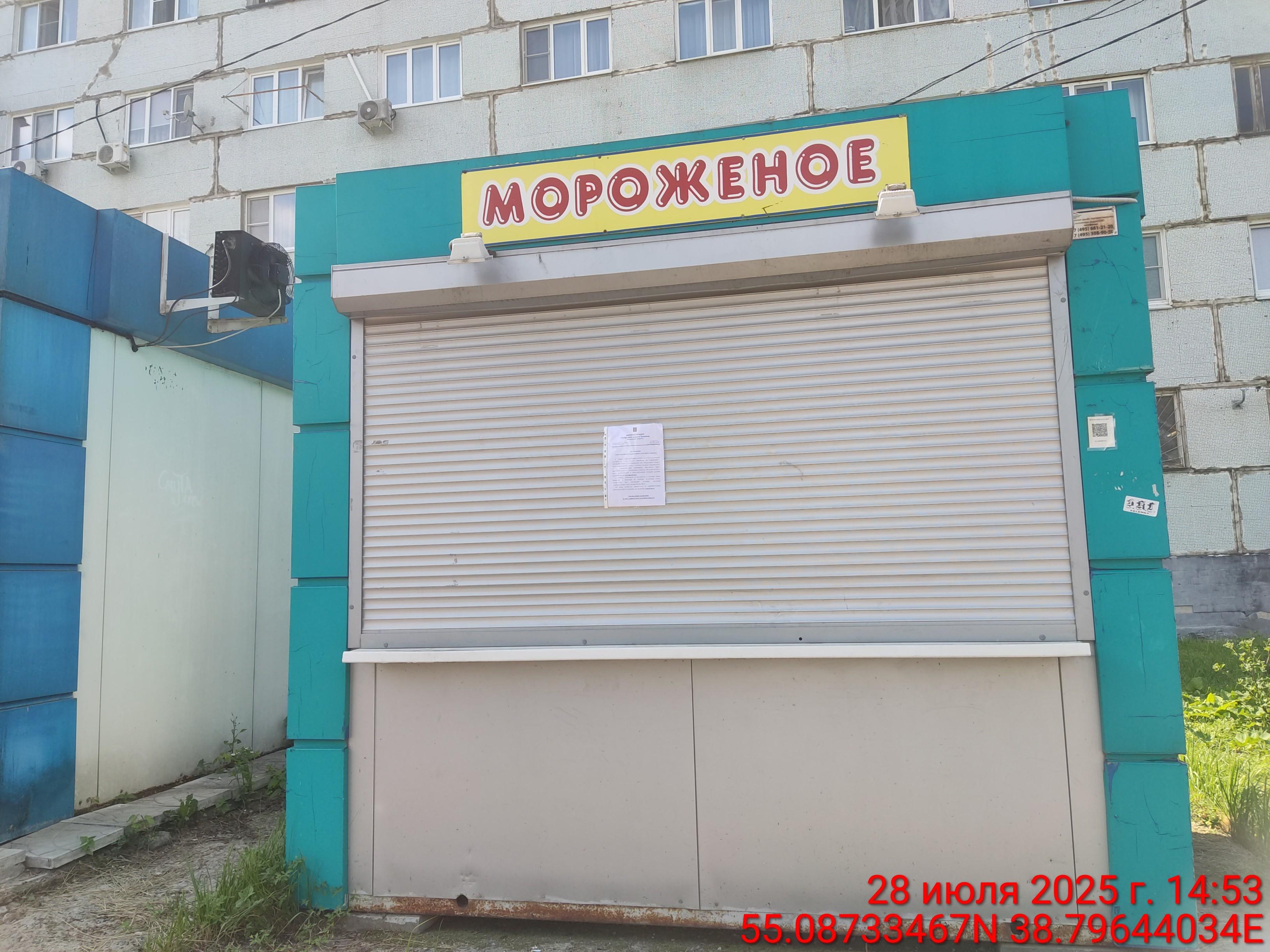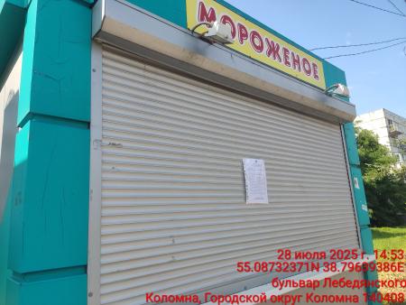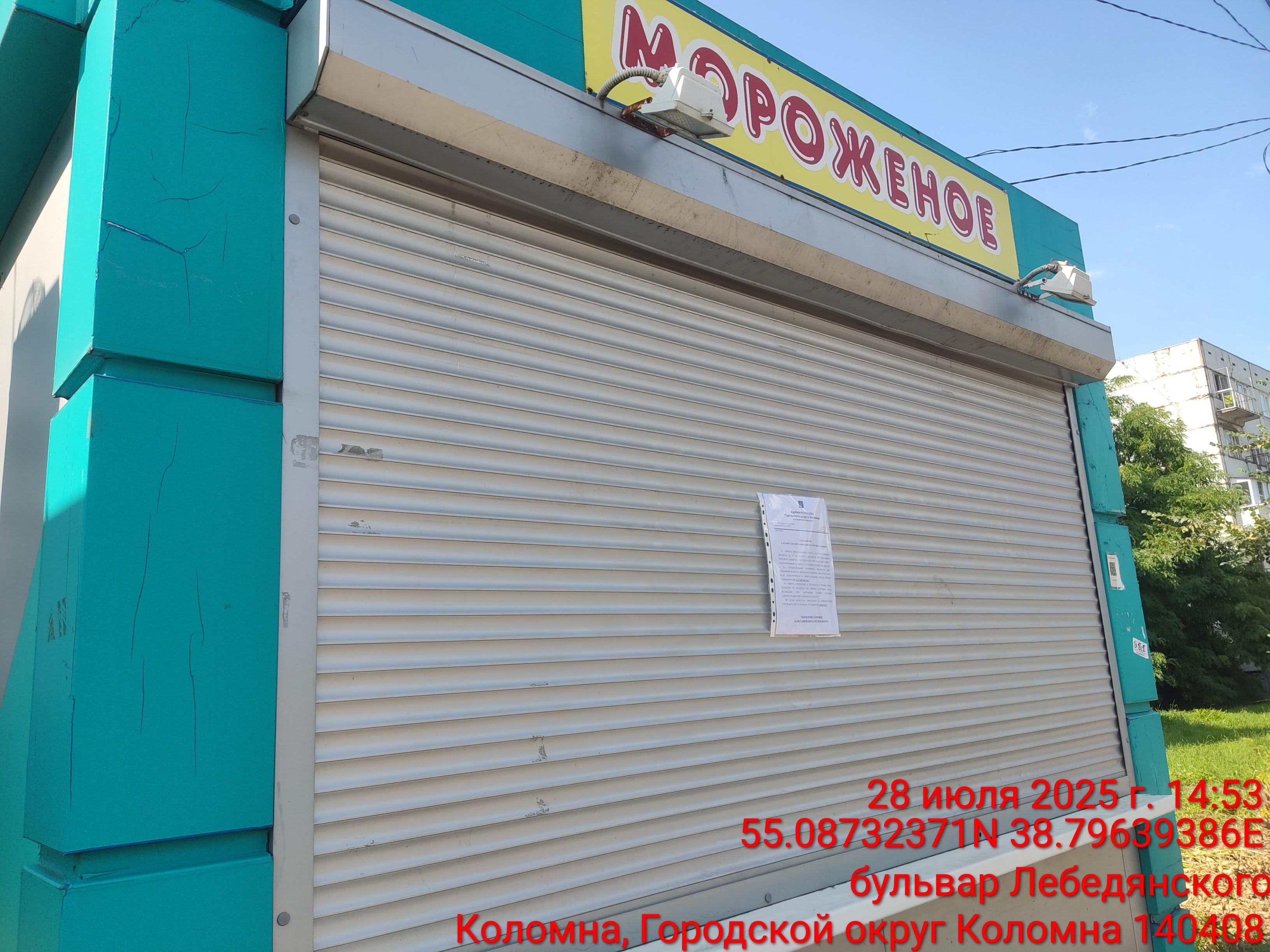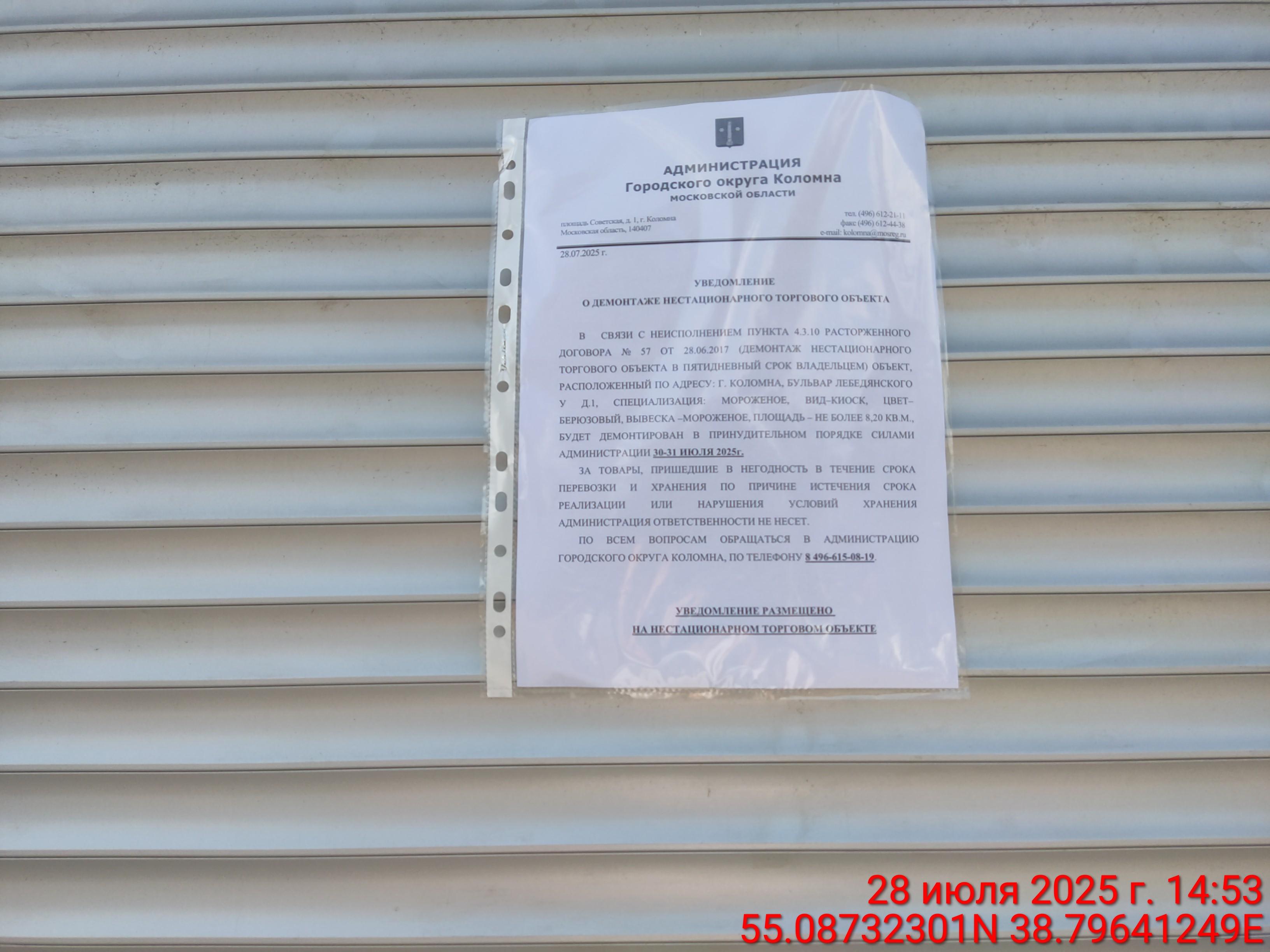 Уведомление о демонтаже нестационарного торгового объекта по адресу: г.Коломна, бульв Лебедянского, у д.1, в связи с расторжением договора №57 от 28.06.17. Специализация-мороженое, вид-киоск, цвет-бирюзовый, вывеска-Мороженое, пл.-не более 8,20 кв.м.