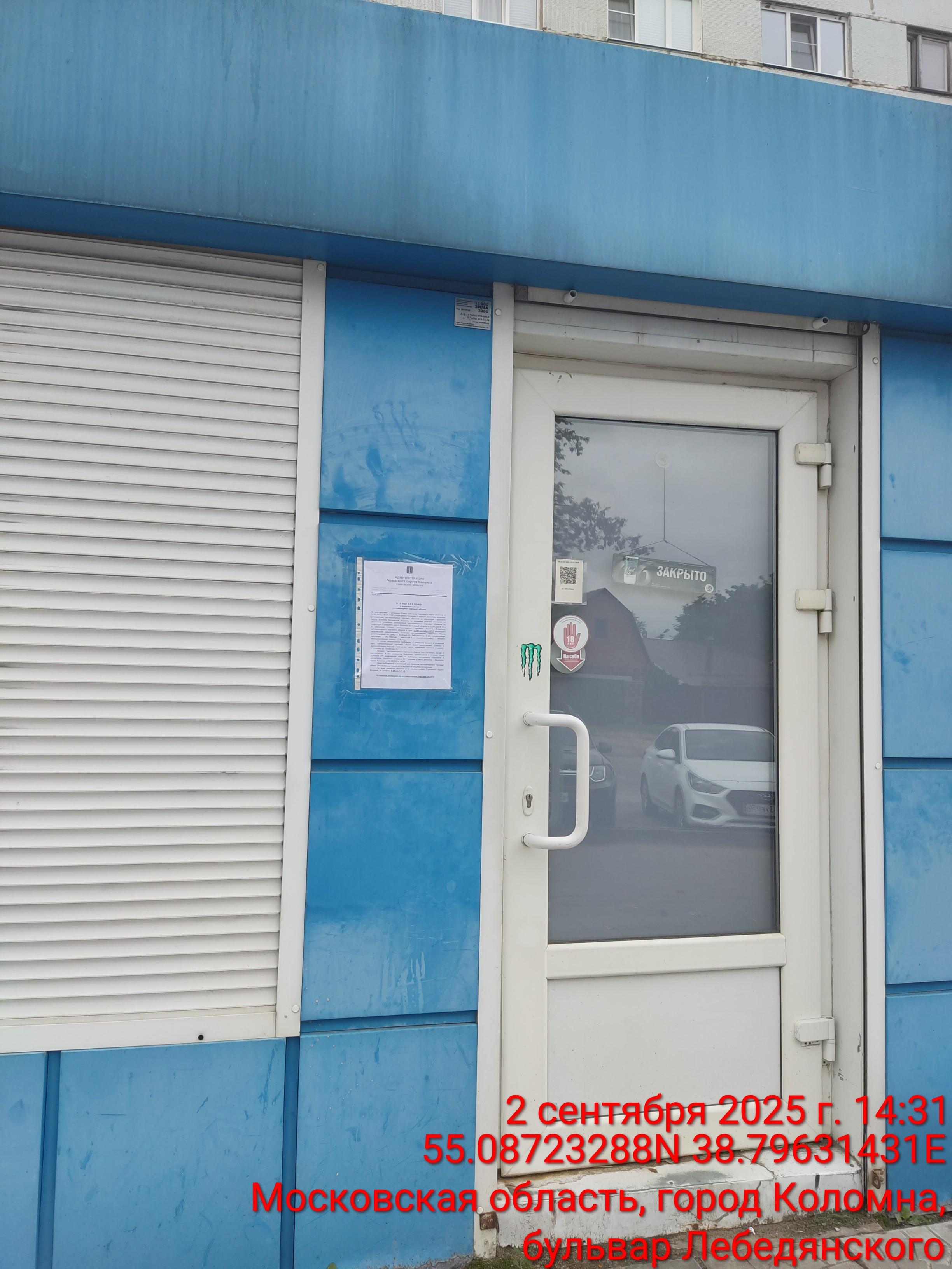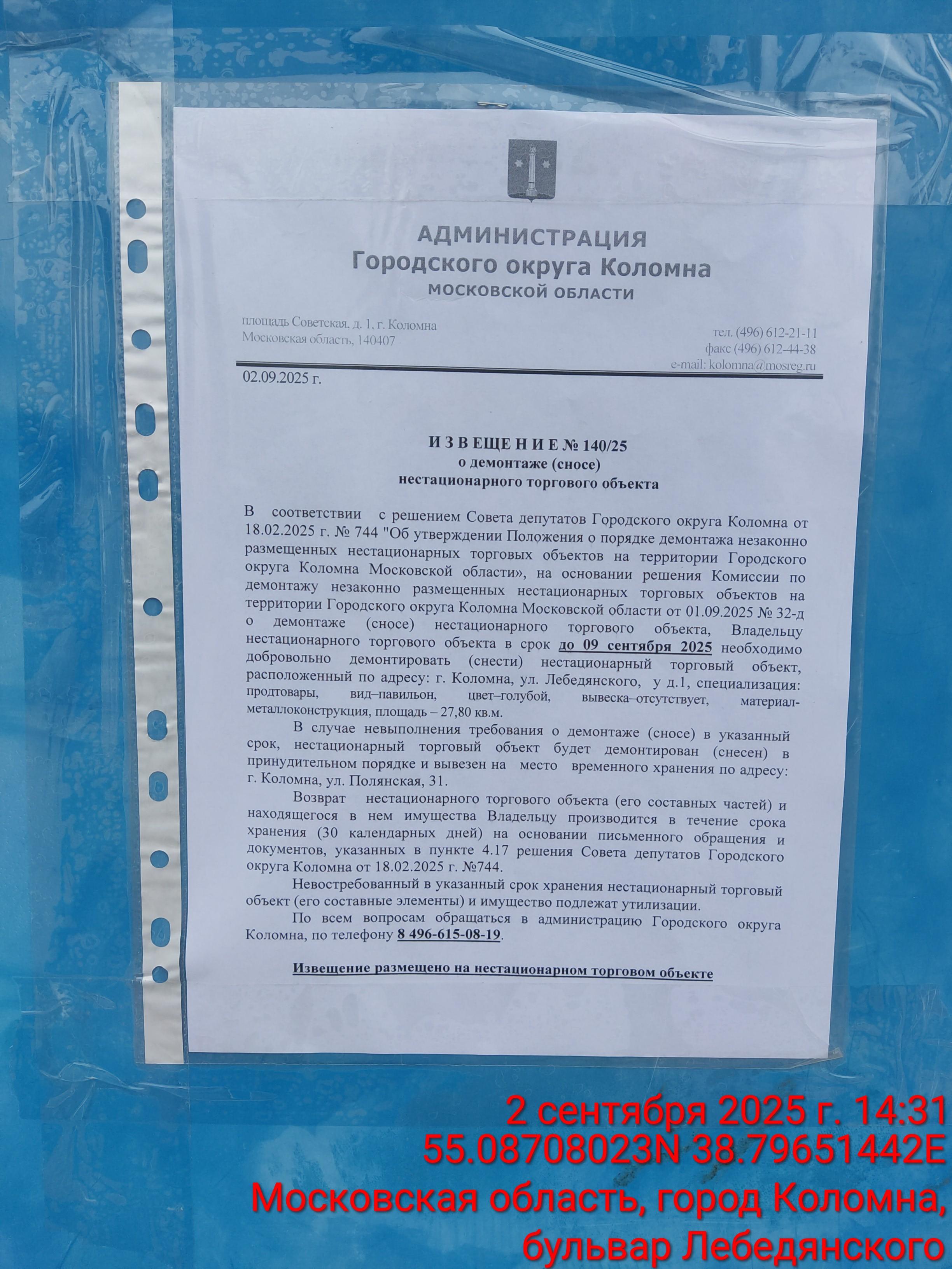 Извещение № 140/25 о демонтаже НТО по адресу: г. Коломна, ул. Лебедянского, у д. 1, специализация: продтовары, вид –павильон, цвет– голубой, вывеска –отсутствует, материал-металлоконструкция, площадь – 27,80 кв.м.