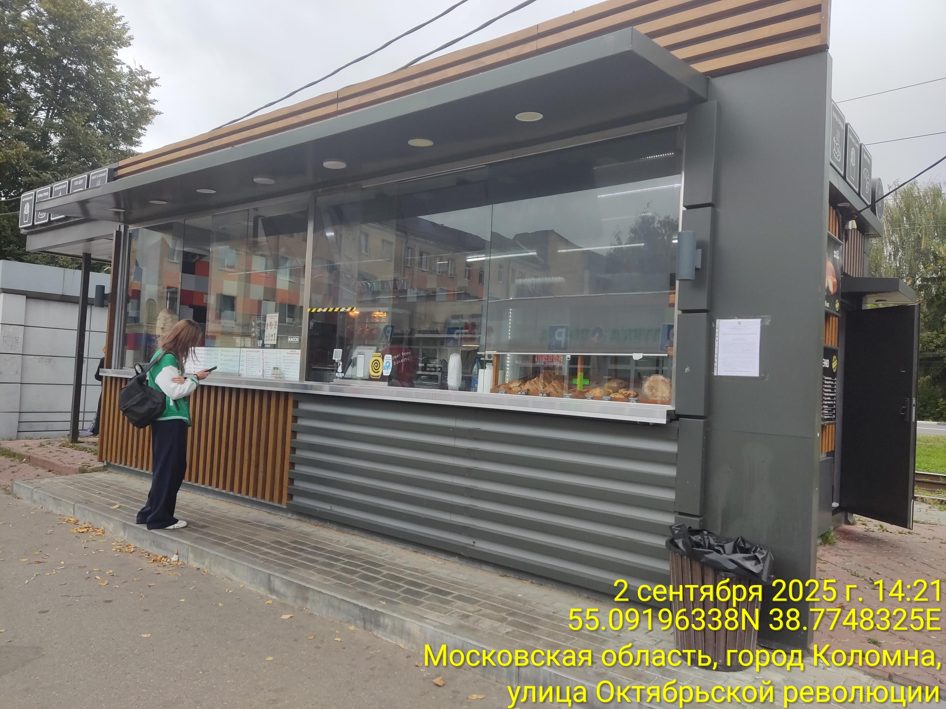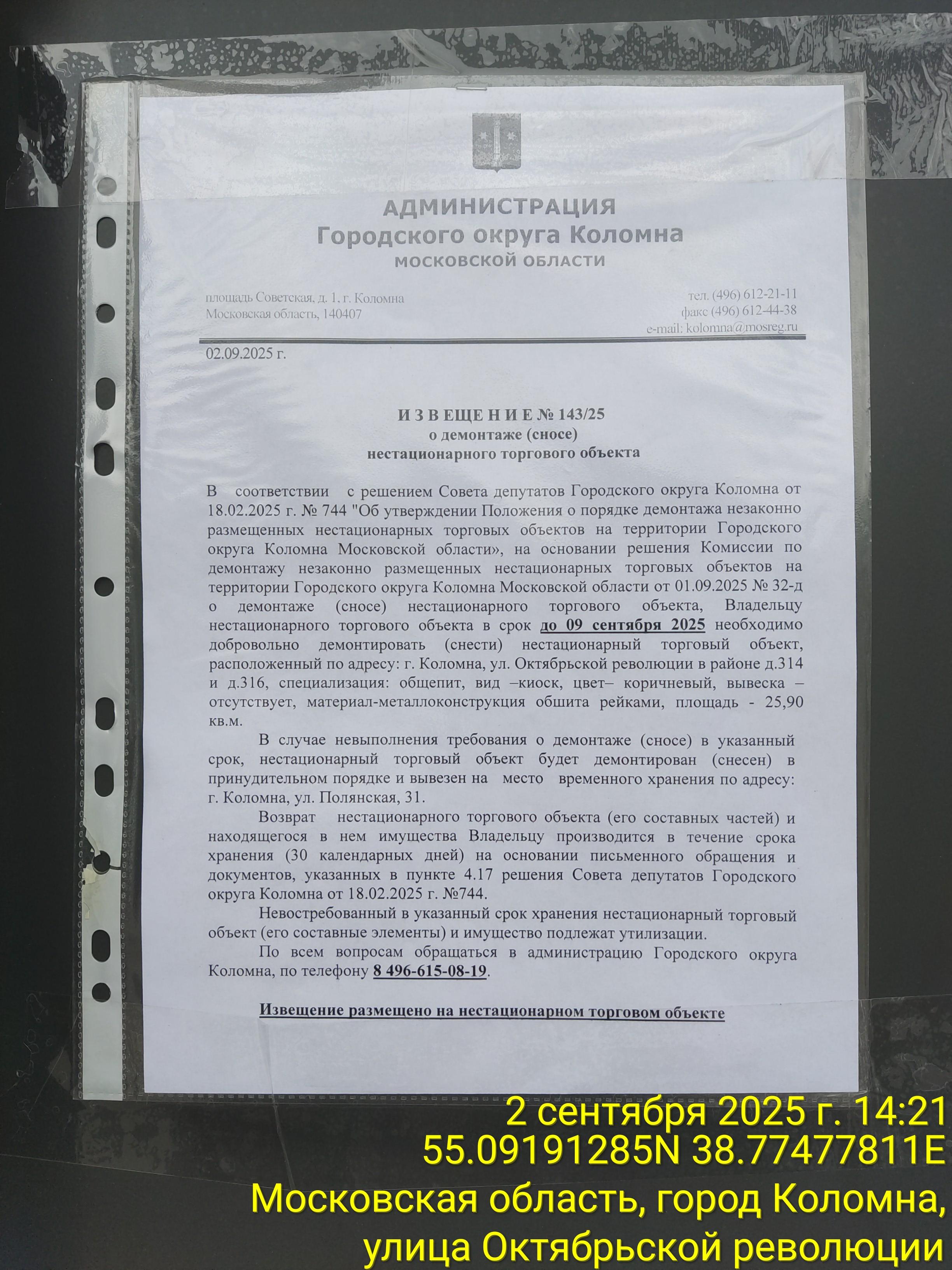 Извещение № 143/25 о демонтаже НТО по адресу: г. Коломна, ул. Октябрьской революции в районе д.314 и д.316, специализация: общепит, вид –киоск, цвет– коричневый, вывеска –отсутствует, материал-металлоконструкция обшита рейками, площадь - 25,90 кв.м.