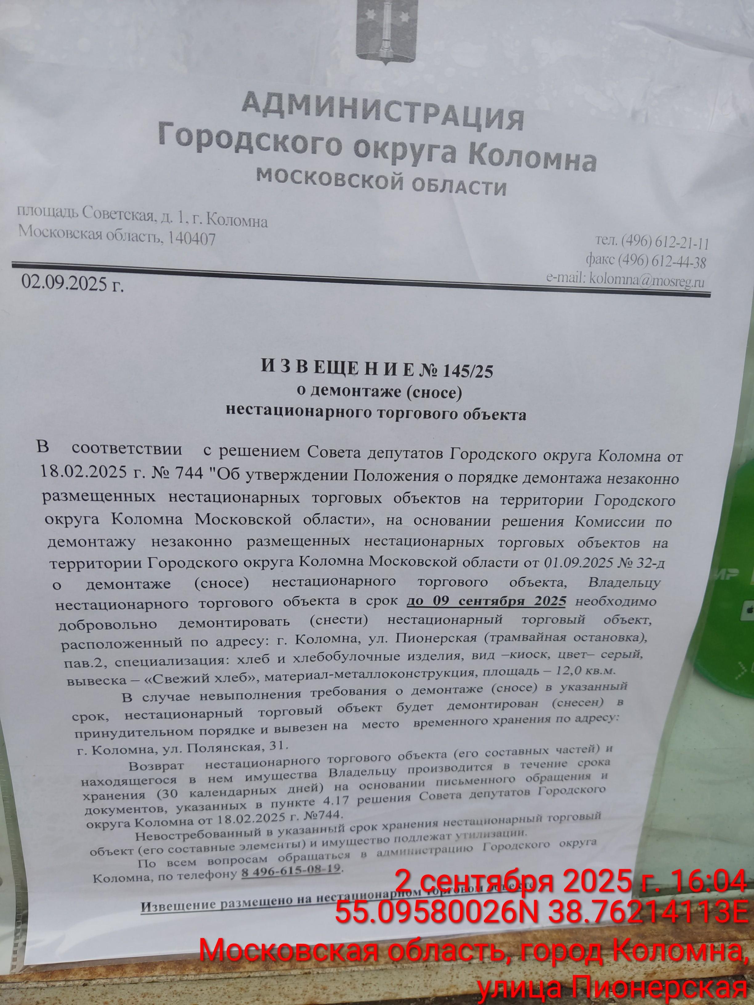 Извещение № 145/25 о демонтаже НТО по адресу: г. Коломна, ул. Пионерская (трамвайная остановка), пав.2, специализация: хлеб и хлебобулочные изделия, вид –киоск, цвет– серый, вывеска – «Свежий хлеб», материал-металлоконструкция, площадь – 12,00 кв.м.