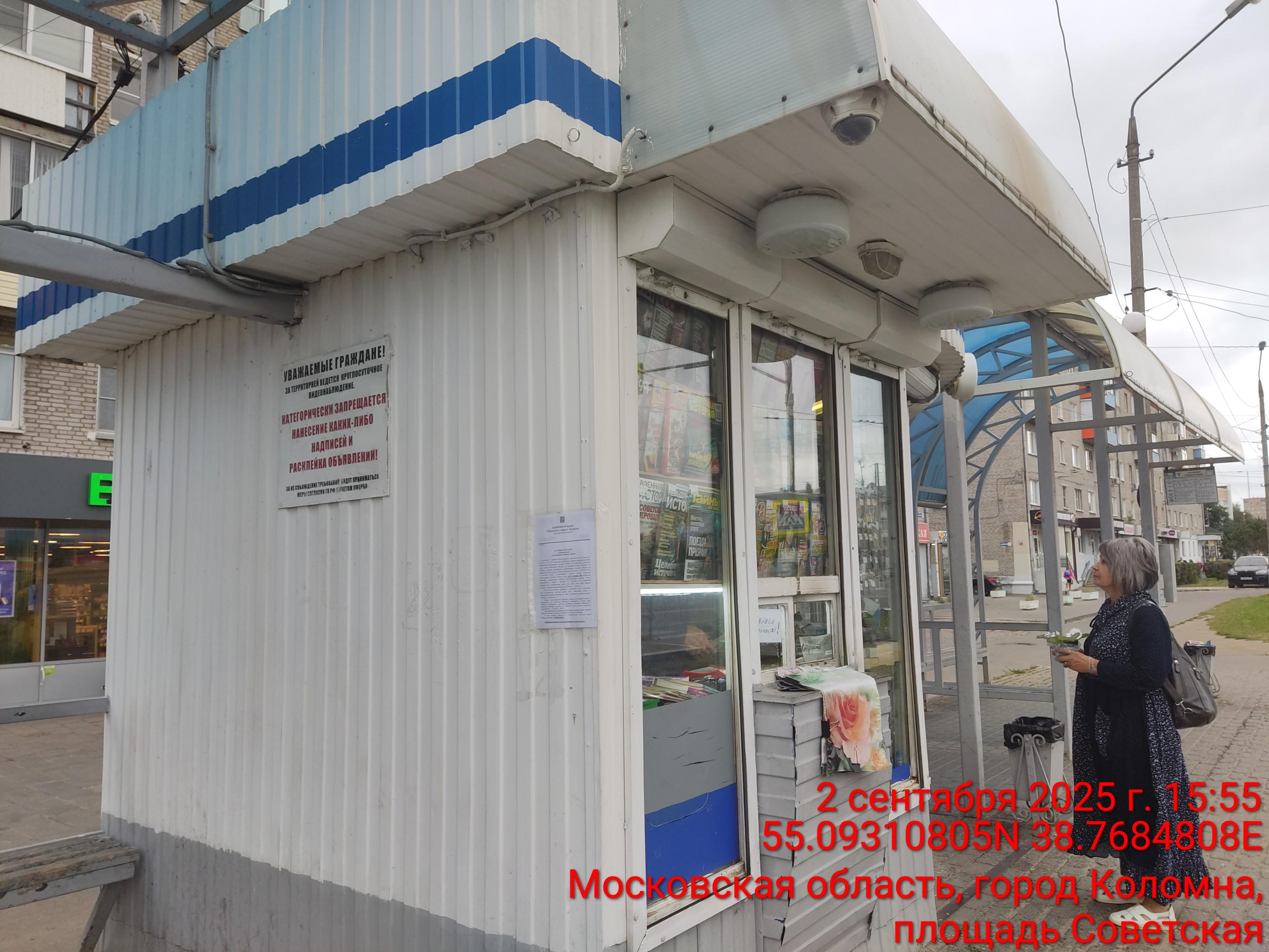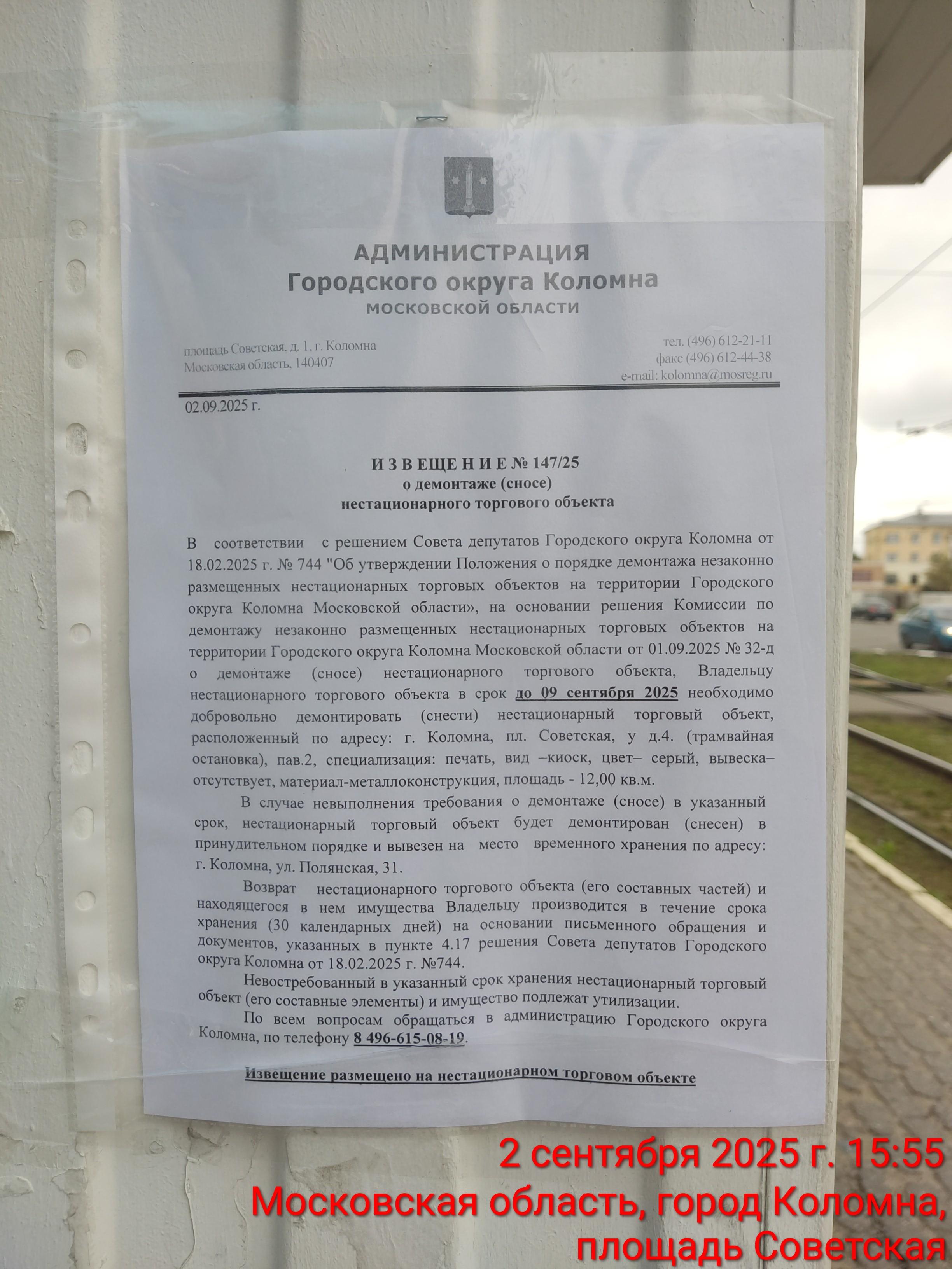 Извещение № 147/25 о демонтаже НТО по адресу: г. Коломна, пл. Советская, у д.4. (трамвайная остановка), пав.2, специализация: печать, вид –киоск, цвет– серый, вывеска – отсутствует, материал-металлоконструкция, площадь - 12,00 кв.м.