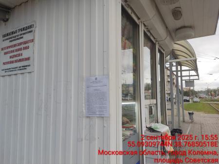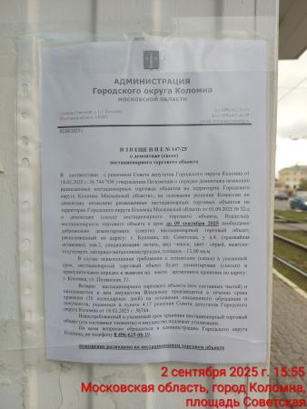 Администрация Городского округа Коломна » Деятельность » Потребительский рынок » Документы » Извещение № 147/25 о демонтаже НТО по адресу: г. Коломна, пл. Советская, у д.4. (трамвайная остановка), пав.2, специализация: печать, вид –киоск, цвет– серый, вывеска – отсутствует, материал-металлоконструкция, площадь - 12,00 кв.м.