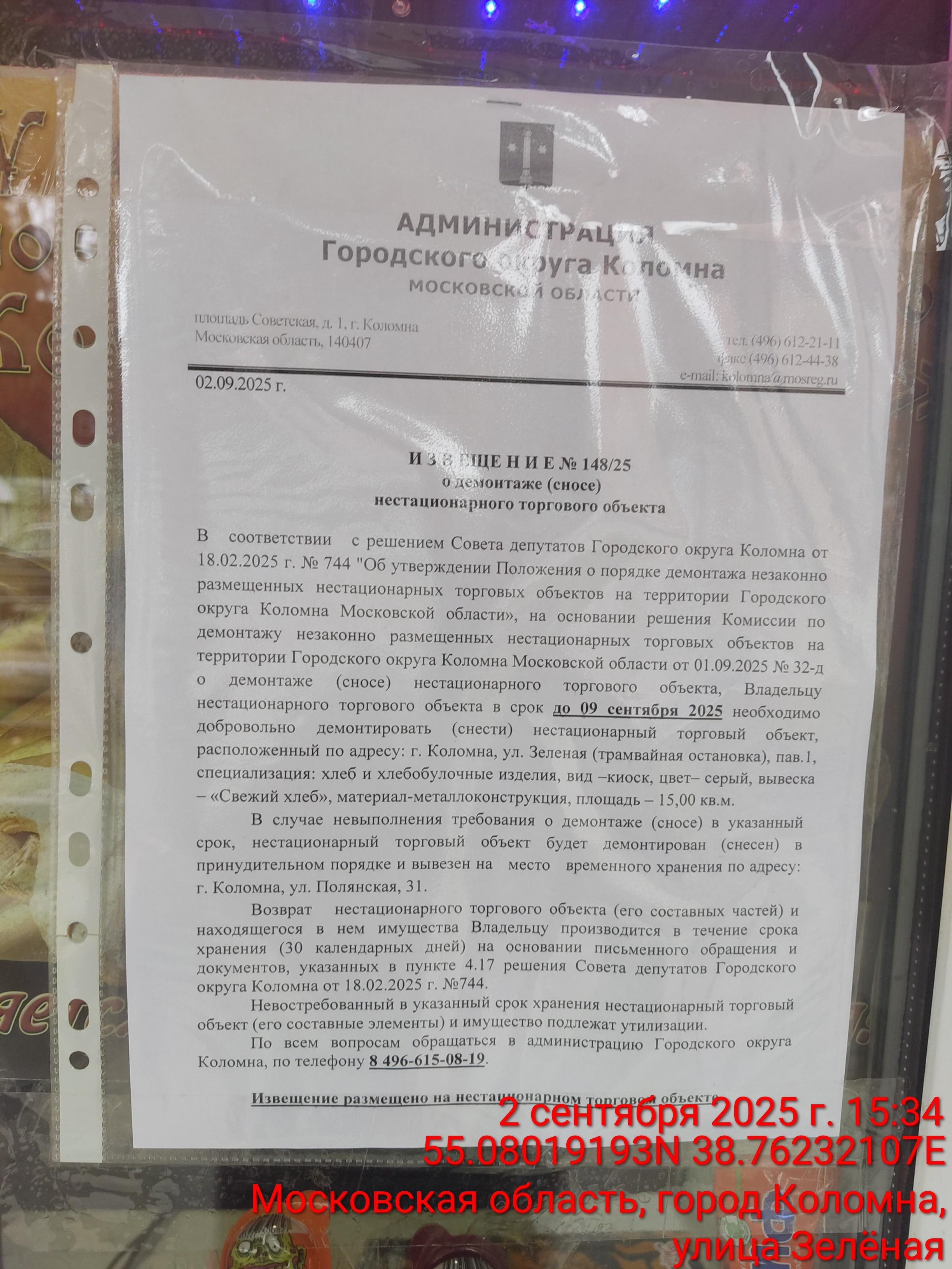 Извещение № 148/25 о демонтаже НТО по адресу: г. Коломна, ул. Зеленая (трамвайная остановка), пав.1, специализация: хлеб и хлебобулочные изделия, вид –киоск, цвет– серый, вывеска – «Свежий хлеб», материал-металлоконструкция, площадь – 15,00 кв.м.