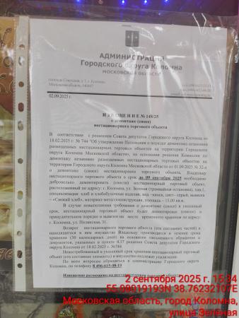 Извещение № 12/22 о демонтаже нестационарного торгового объекта расположенного по адресу: г.Коломна, пересечение ул. Зеленая д.38 и ул. Калинина (ближе к д. 38), специализация: хлеб, хлебобулочные изделия (вывеска – свежий хлеб)15 ноябрь 2022Извещение № 19/22 о демонтаже нестационарного торгового объекта расположенного по адресу: г.Коломна, ул. Октябрьской революции между д.316 и д.318А, специализация: хлеб, хлебобулочные изделия (вывеска – свежий хлеб), цвет – серый16 ноябрь 2022Извещение № 145/25 о демонтаже НТО по адресу: г. Коломна, ул. Пионерская (трамвайная остановка), пав.2, специализация: хлеб и хлебобулочные изделия, вид –киоск, цвет– серый, вывеска – «Свежий хлеб», материал-металлоконструкция, площадь – 12,00 кв.м.02 сентябрь 2025Извещение № 136/25 о демонтаже НТО по адресу: г. Коломна, ул. Ленина у д.67-а, специализация: хлеб и хлебобулочные изделия, вид –павильон, цвет– серый, вывеска – «Свежий хлеб», материал-металлоконструкция, площадь - 26,00 кв.м.26 июнь 2025Извещение № 146/25 о демонтаже НТО по адресу: г. Коломна, пл. Советская, у д.4. (трамвайная остановка), пав.1, специализация: промышленные товары, вид –киоск, цвет– серый, вывеска – отсутствует, материал-металлоконструкция, площадь - 12,00 кв.м.02 сентябрь 2025