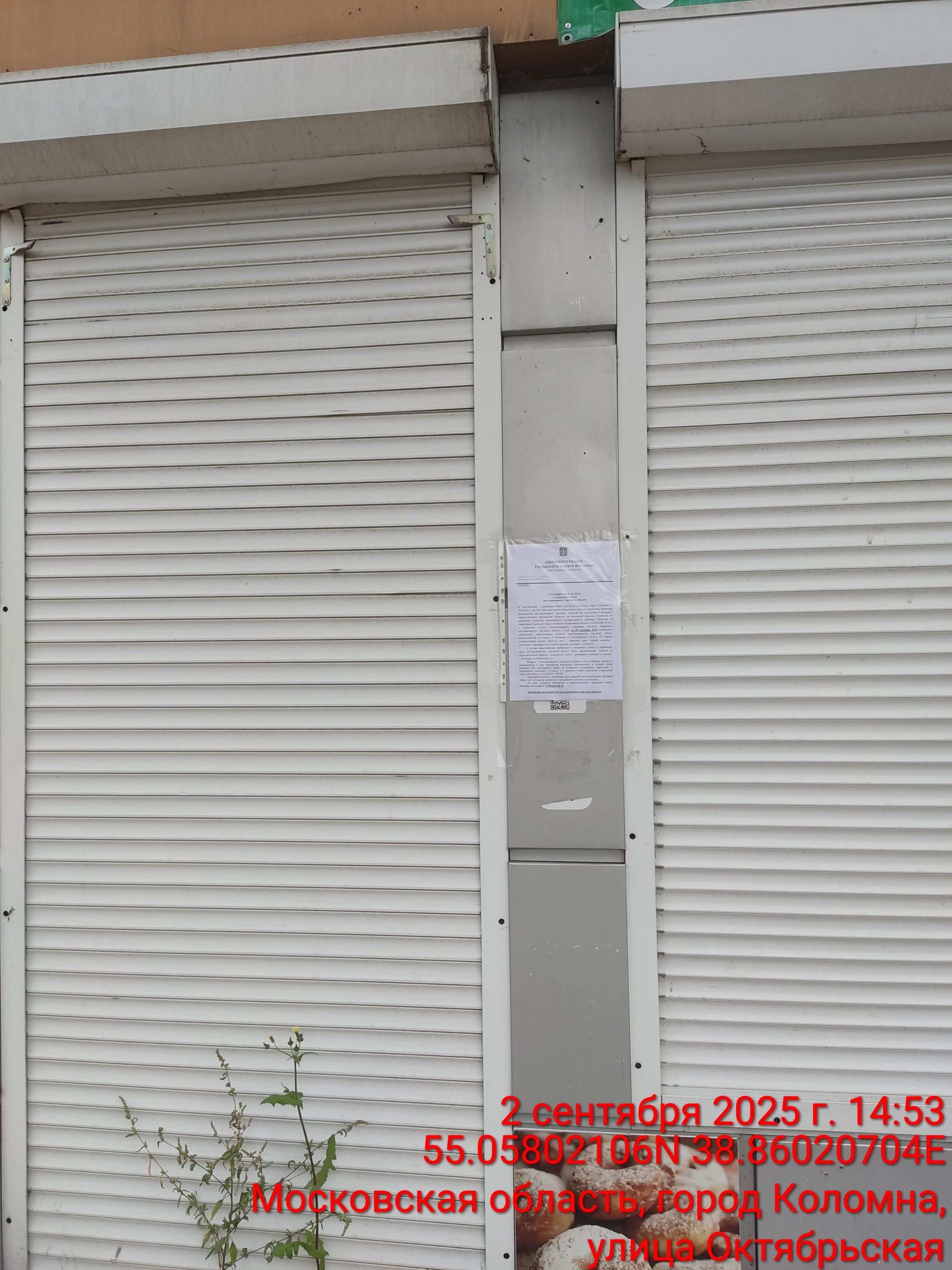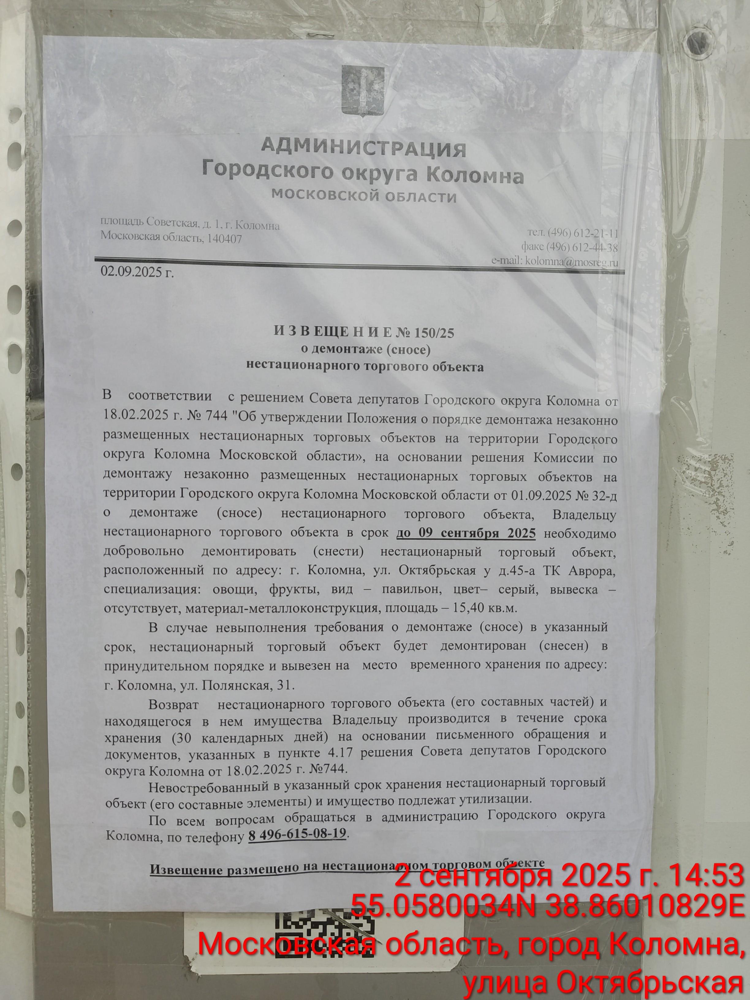Администрация Городского округа Коломна » Деятельность » Потребительский рынок » Документы » Извещение № 150/25 о демонтаже НТО по адресу: г. Коломна, ул. Октябрьская у д.45-а ТК Аврора, специализация: овощи, фрукты, вид – павильон, цвет– серый, вывеска –отсутствует, материал-металлоконструкция, площадь – 15,40 кв.м.