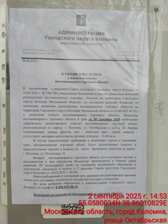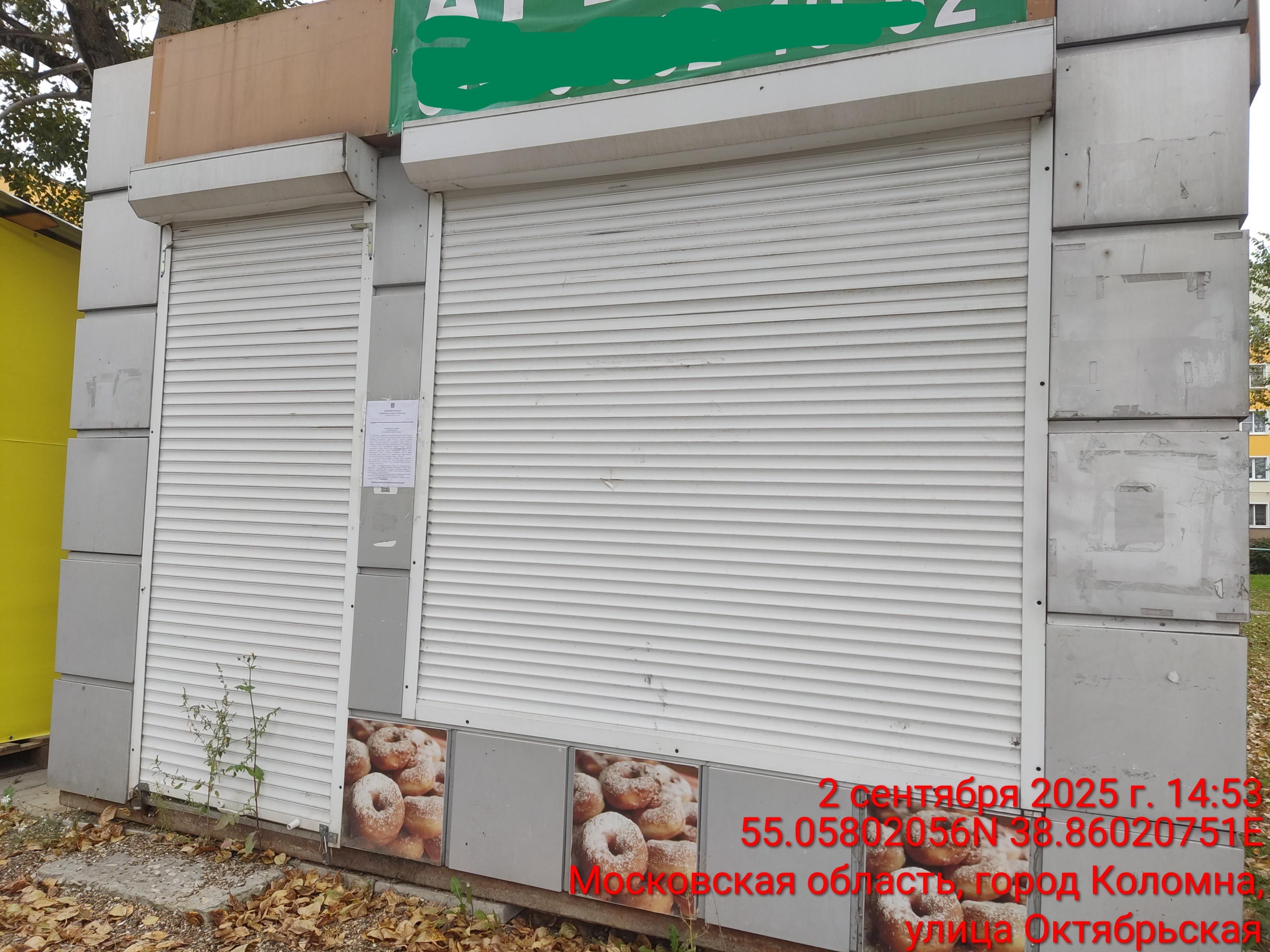 Извещение № 150/25 о демонтаже НТО по адресу: г. Коломна, ул. Октябрьская у д.45-а ТК Аврора, специализация: овощи, фрукты, вид – павильон, цвет– серый, вывеска –отсутствует, материал-металлоконструкция, площадь – 15,40 кв.м.