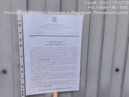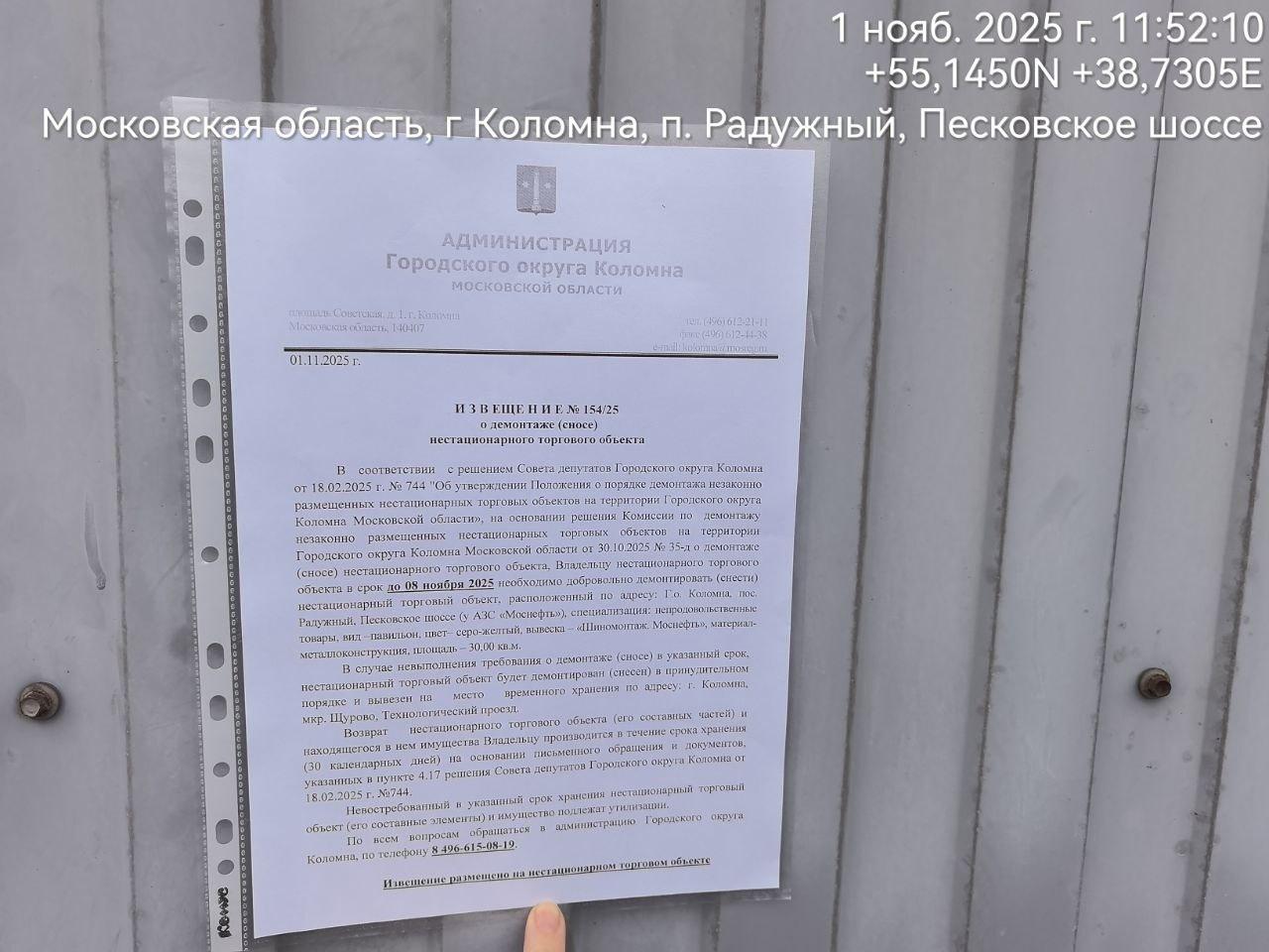 Извещение № 154/25 о демонтаже НТО по адресу: Г.о. Коломна, п.Радужный, Песковское ш. (у АЗС Моснефть), специализация: непродовольственные товары, вид –павильон, цвет– серо-желтый, вывеска – «Шиномонтаж. Моснефть», металлоконструкция, пл. – 30 кв.м.