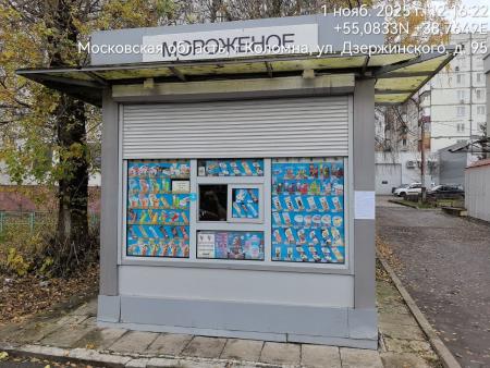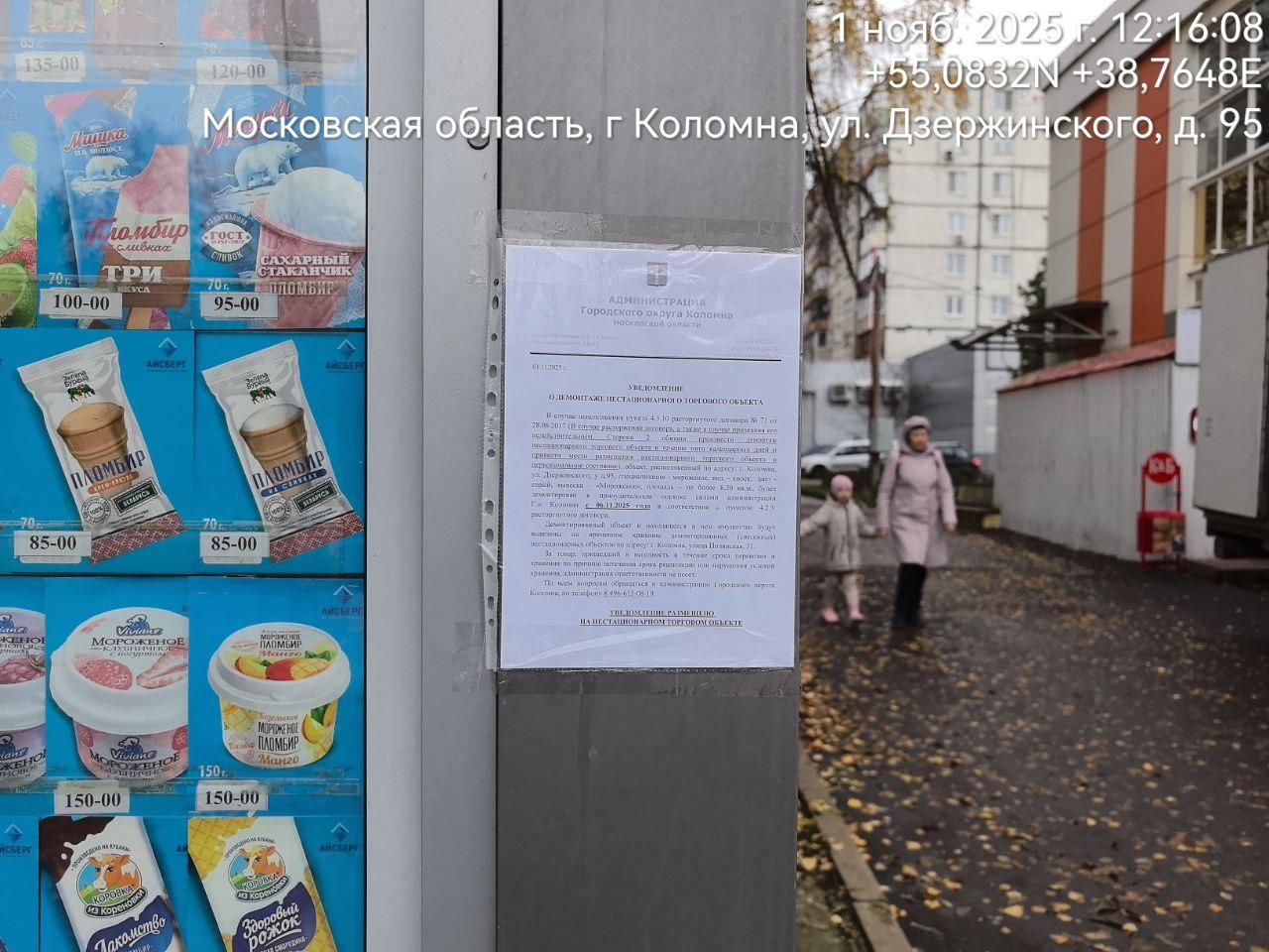 Уведомление о демонтаже нестационарного торгового объекта по адресу: г. Коломна, ул. Дзержинского, у д.95, специализация - мороженое, вид – киоск, цвет - серый, вывеска – «Мороженое», площадь – не более 8,20 кв.м.