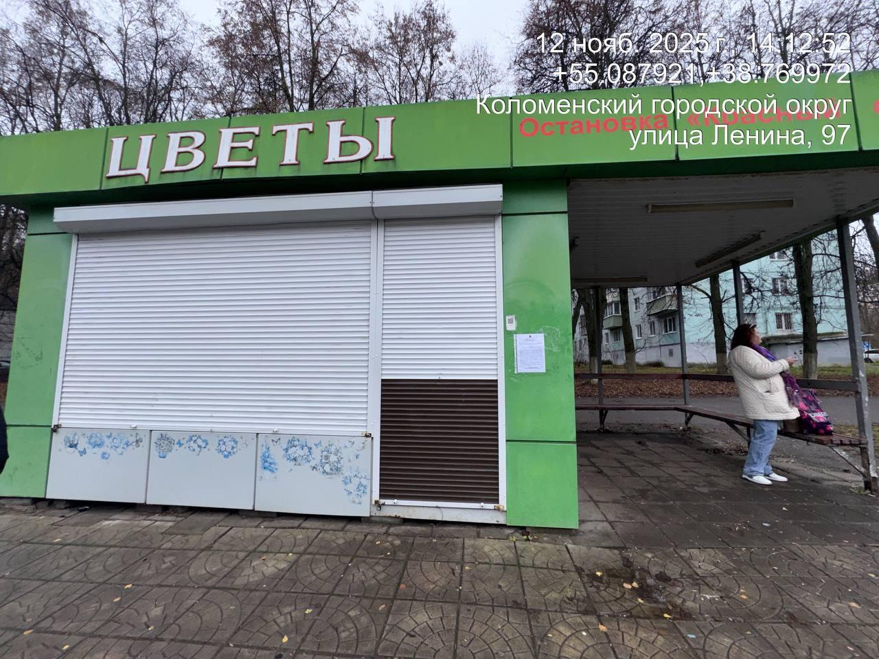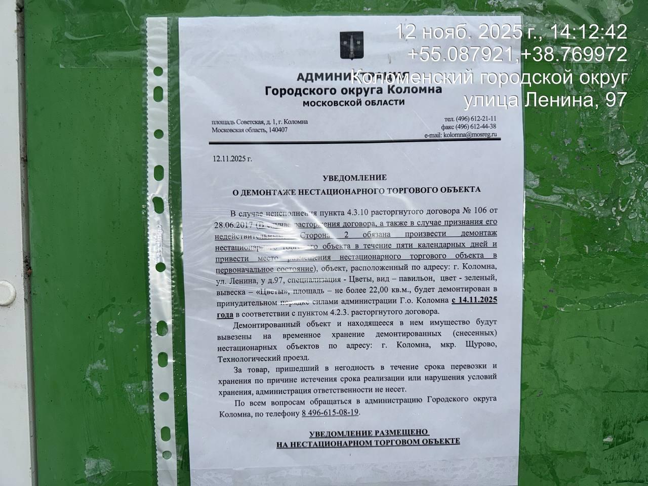 Уведомление о демонтаже нестационарного торгового объекта по адресу: г. Коломна, ул. Ленина, у д.97, специализация - Цветы, вид – павильон, цвет - зеленый, вывеска – «Цветы», материал-металлоконструкция, площадь – не более 22,00 кв.м.
