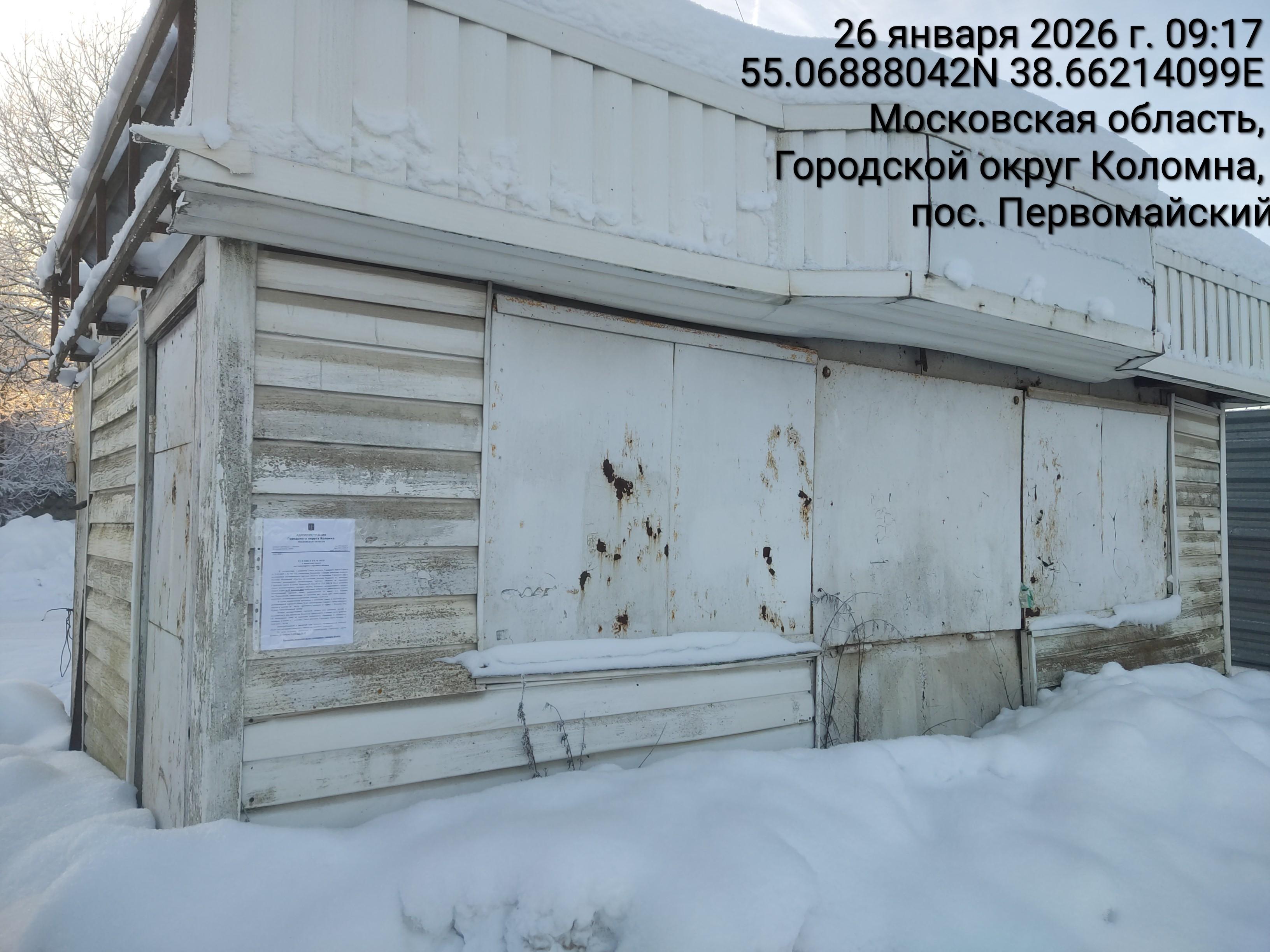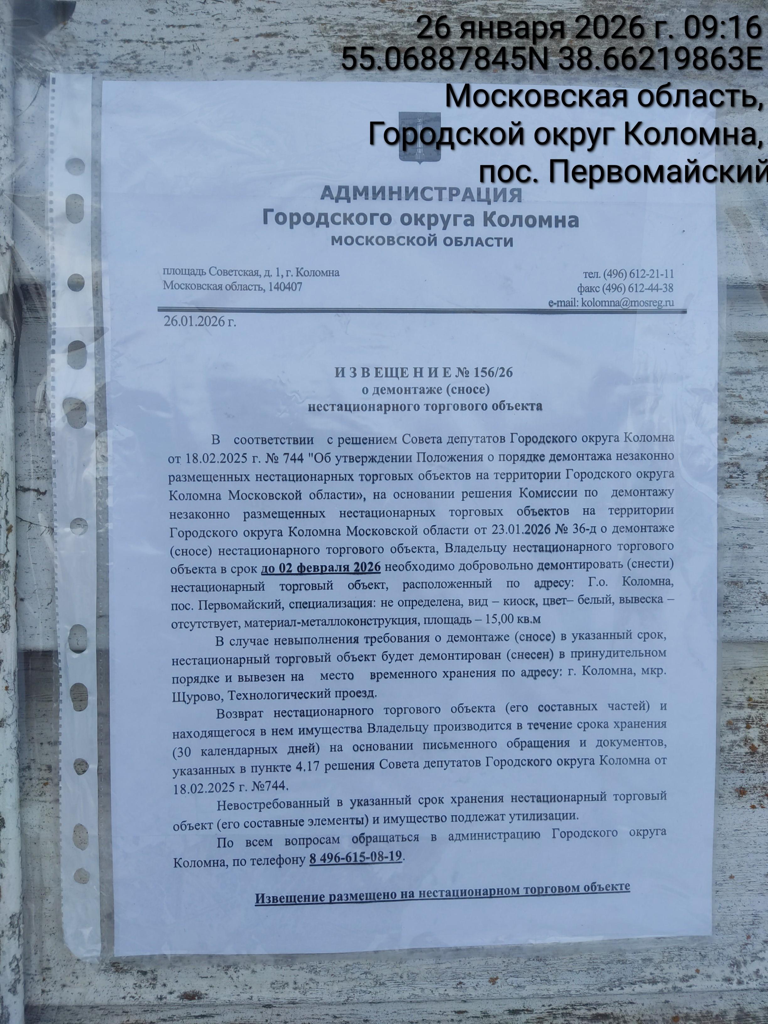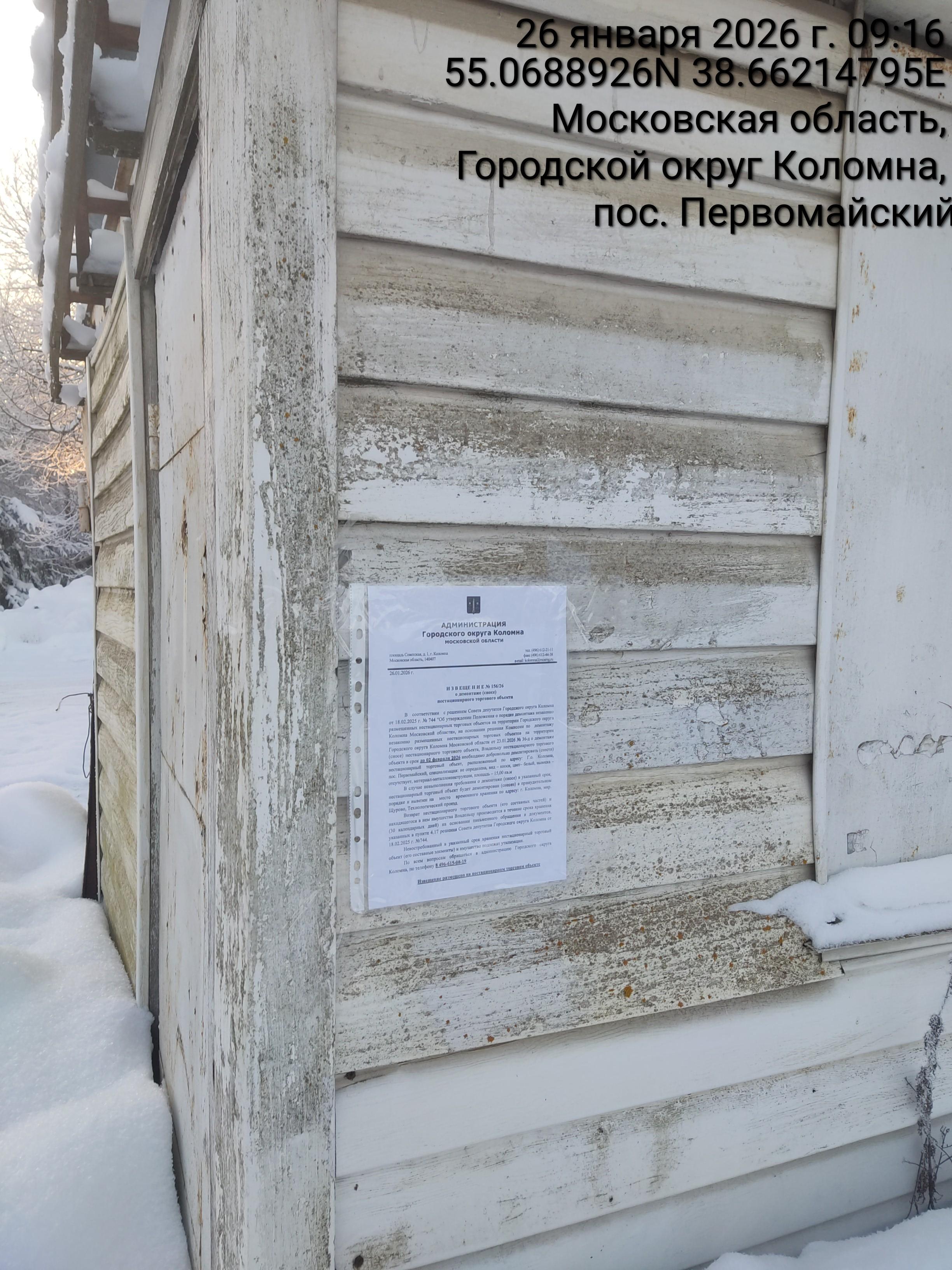 Извещение № 156/26 о демонтаже НТО по адресу: Г.о. Коломна, пос. Первомайский, специализация: не определена, вид – киоск, цвет– белый, вывеска – отсутствует, материал-металлоконструкция, площадь – 15,00 кв.м.