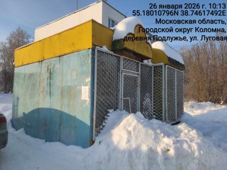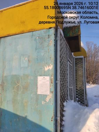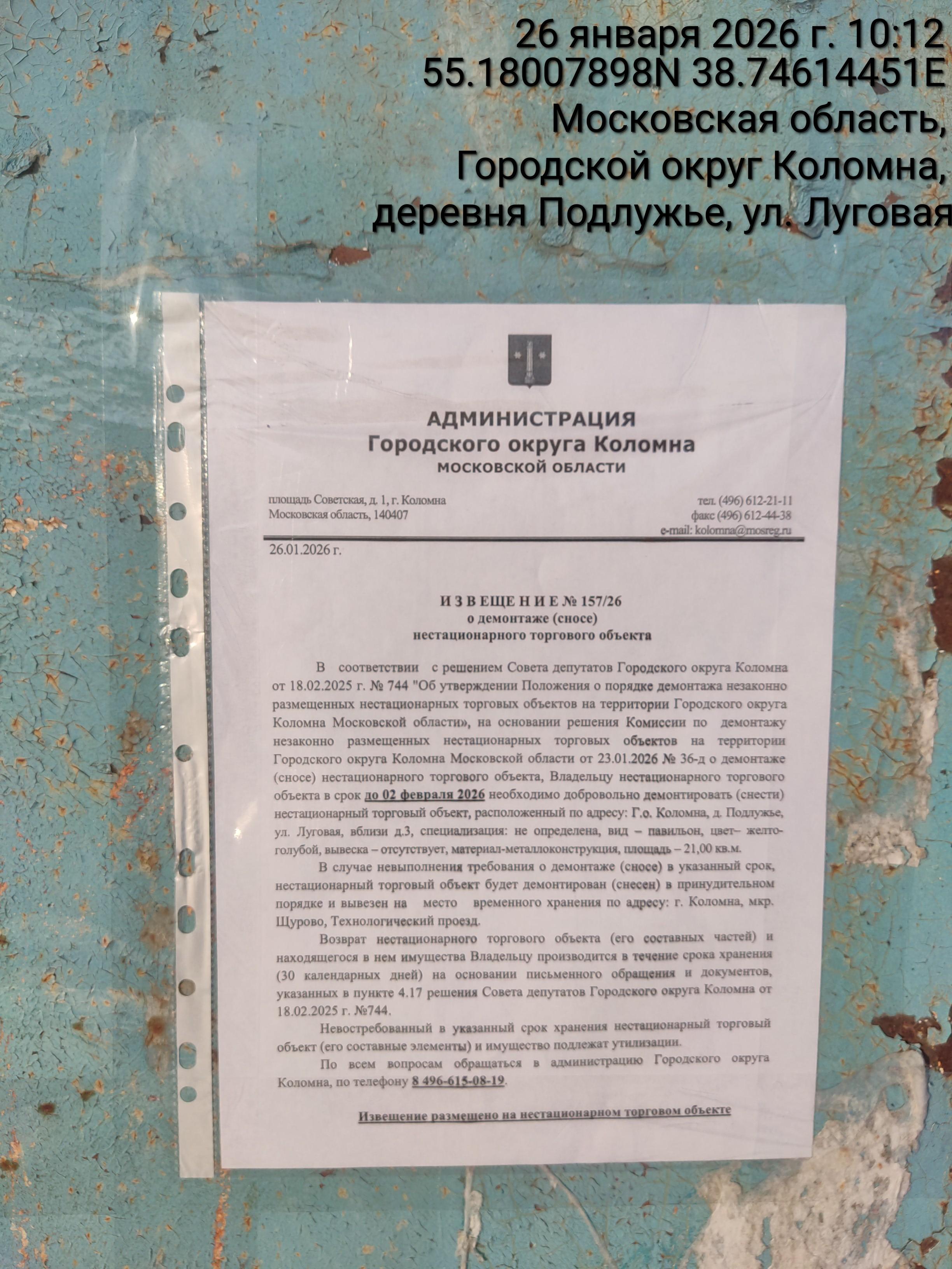Извещение № 157/26 о демонтаже НТО по адресу: Г.о. Коломна, д. Подлужье, ул. Луговая, вблизи д.3, специализация: не определена, вид – павильон, цвет– желто-голубой, вывеска – отсутствует, материал-металлоконструкция, площадь – 21,00 кв.м.