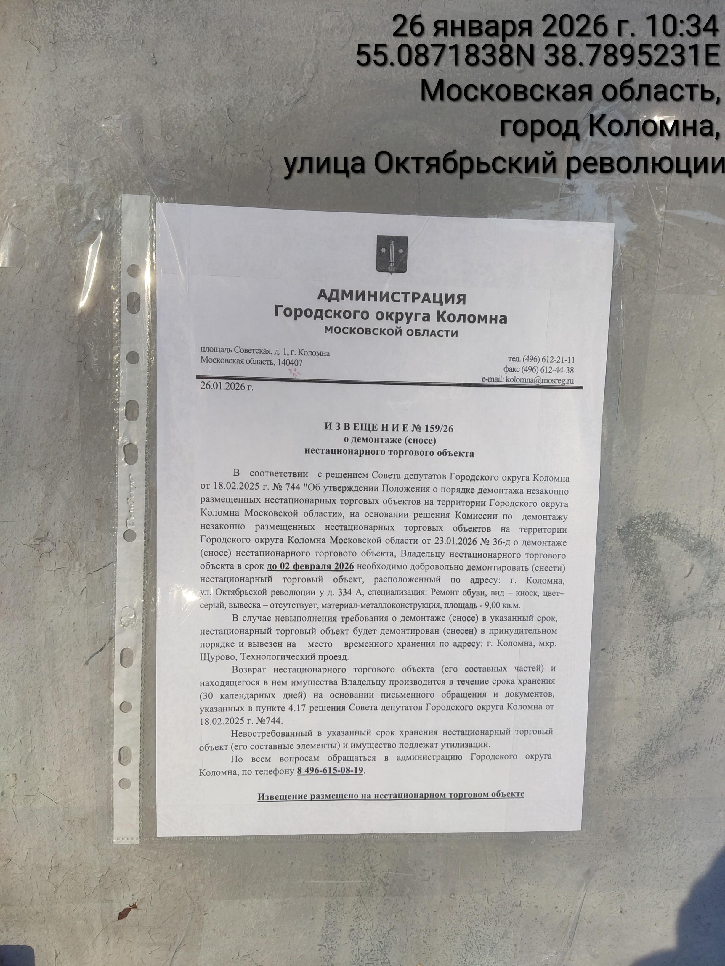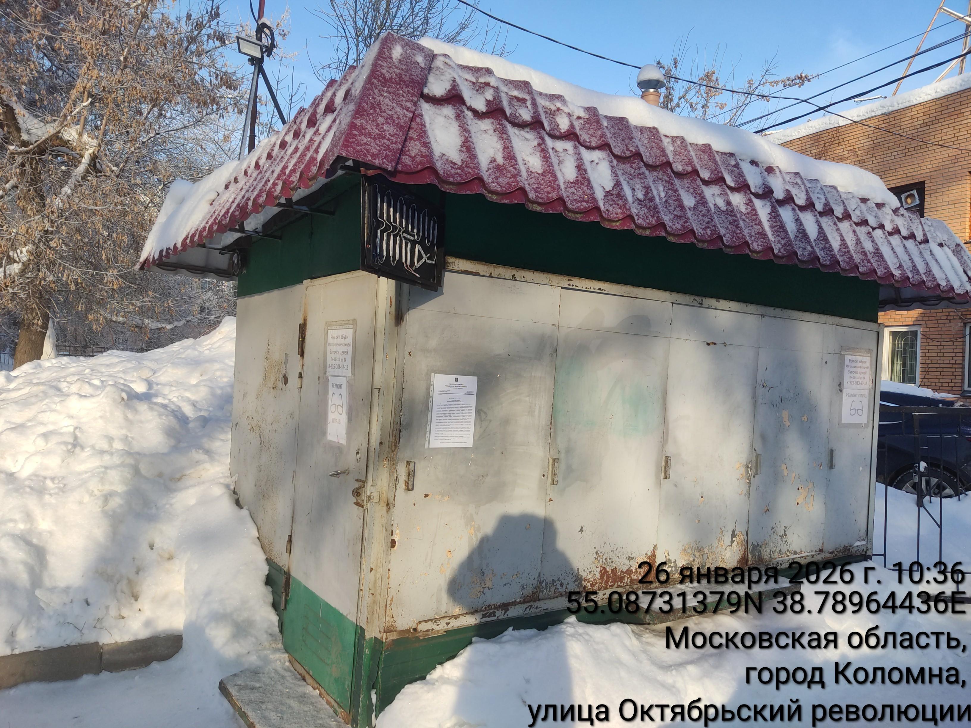 Извещение № 159/26 о демонтаже НТО по адресу: г. Коломна, ул. Октябрьской революции, у д. 334 А, специализация: Ремонт обуви, вид – киоск, цвет–серый, вывеска – отсутствует, материал-металлоконструкция, площадь - 9,00 кв.м.