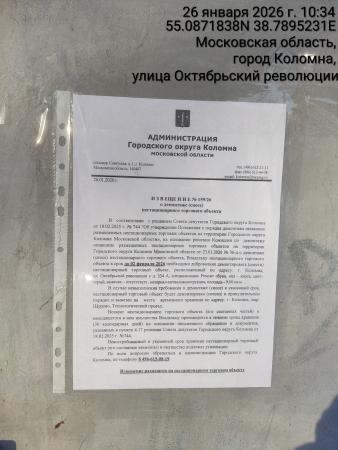 Извещение № 123/25 о демонтаже НТО по адресу: г. Коломна, ул. Дзержинского, у д.95, специализация: ремонт обуви, вид –киоск, цвет–серый с оранжевыми вставками, вывеска – «Ремонт обуви, Галантереи», материал-металлоконструкция, площадь - 12,70 кв.м.23 апрель 2025Извещение № 5/22 о демонтаже нестационарного торгового объекта расположенного по адресу: г.Коломна, пл. Восстания у д. 4, специализация: не определена (нестационарный объект – закрыт, сверху вывеска овощи и фрукты), вид – павильон, цвет – серый15 ноябрь 2022Извещение № 9/22 о демонтаже нестационарного торгового объекта расположенного по адресу: г.Коломна, ул. Гаврилова в районе д. 2, специализация: не определена (нестационарный объект – закрыт, вывеска – свежее мясо), вид – павильон, цвет – серый15 ноябрь 2022Извещение № 19/22 о демонтаже нестационарного торгового объекта расположенного по адресу: г.Коломна, ул. Октябрьской революции между д.316 и д.318А, специализация: хлеб, хлебобулочные изделия (вывеска – свежий хлеб), цвет – серый16 ноябрь 2022Извещение № 146/25 о демонтаже НТО по адресу: г. Коломна, пл. Советская, у д.4. (трамвайная остановка), пав.1, специализация: промышленные товары, вид –киоск, цвет– серый, вывеска – отсутствует, материал-металлоконструкция, площадь - 12,00 кв.м.02 сентябрь 2025