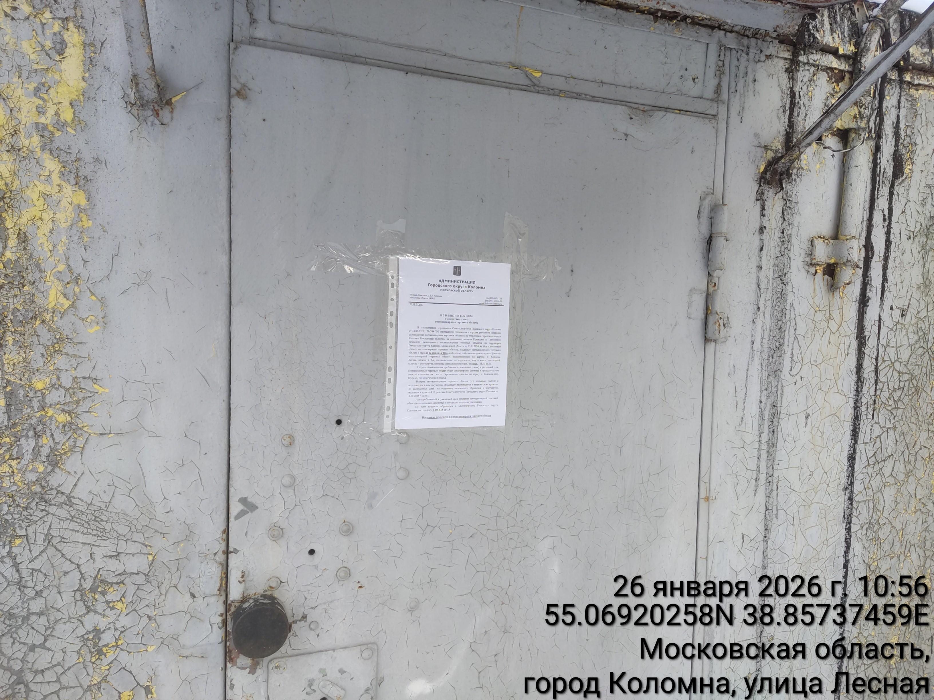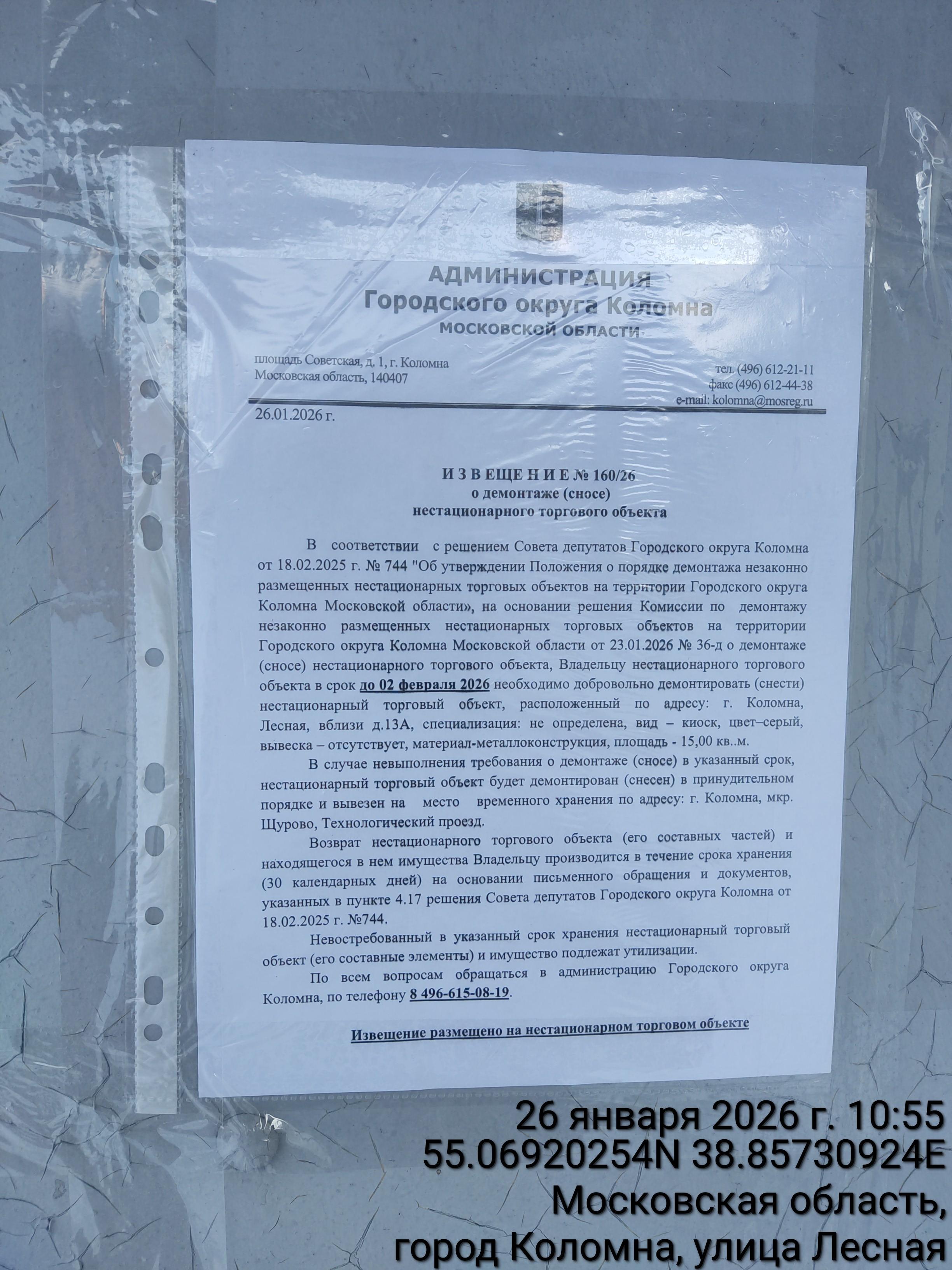 Извещение № 160/26 о демонтаже НТО по адресу: г. Коломна, ул. Лесная, вблизи д.13А, специализация: не определена, вид – киоск, цвет–серый, вывеска – отсутствует, материал-металлоконструкция, площадь - 15,00 кв.м.