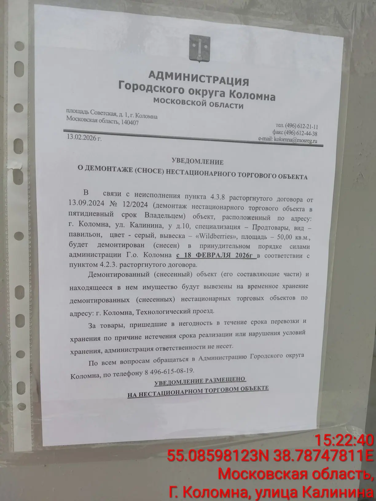 Уведомление о демонтаже (сносе) нестационарного торгового объекта по адресу: г. Коломна, ул. Калинина, у д.10, специализация - Продтовары, вид – павильон, цвет - серый, вывеска – «Wildberries», материал-металлоконструкция, площадь – 50,00 кв.м.