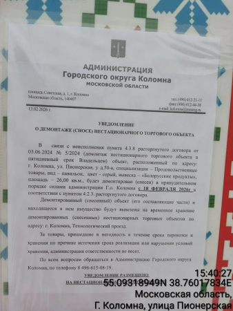 Уведомление о демонтаже нестационарного торгового объекта по адресу: г. Коломна, ул. Пионерская, у д.50а, специализация - Продтовары, вид – павильон, цвет - серый, вывеска – «Белорусские продукты», материал-металлоконструкция, площадь – 26,00 кв.м.