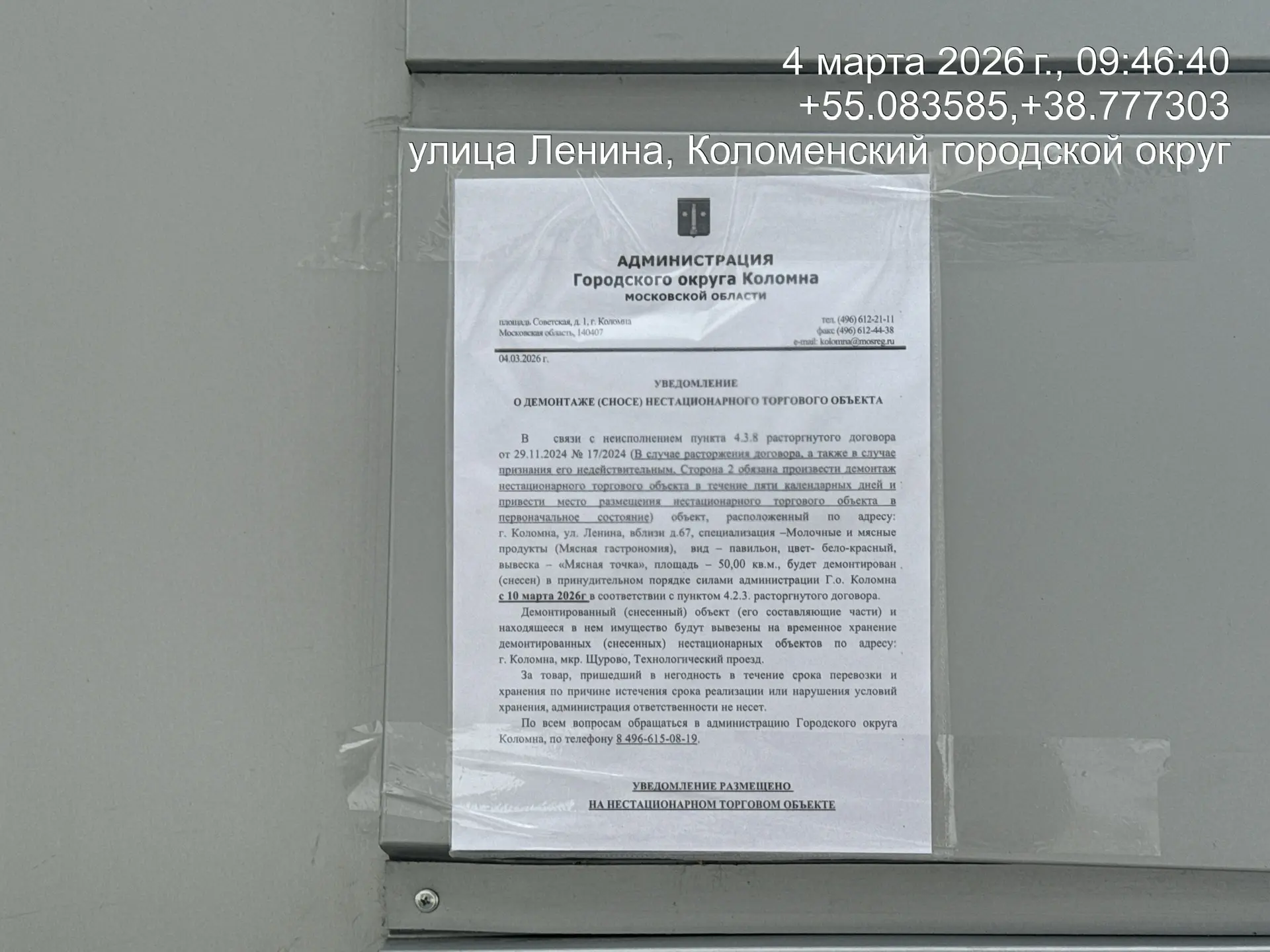 Уведомление о демонтаже (сносе) нестационарного торгового объекта по адресу: г. Коломна, ул. Ленина, вблизи д.67, в связи с расторжением договора №17/2024 от 29.11.24. Специализация-Мясная гастрономия, вид–павильон, цвет-бело-красный, пл.-50 кв.м.