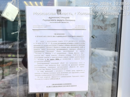 Уведомление о демонтаже (сносе) нестационарного торгового объекта, расположенного по адресу: г. Коломна, ул. Макеева, у д. 2, в связи с расторжением договора № 131 от 20.06.2017. Специализация - Овощи, фрукты, вид - павильон, площадь - 16,4 кв. м.
