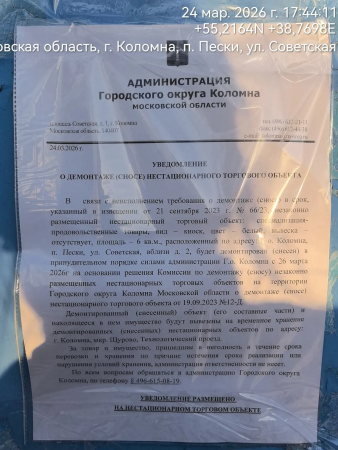 Уведомление о демонтаже (сносе) нестационарного торгового объекта по адресу: г о. Коломна, п. Пески, ул. Советская, вблизи д. 2, специализация- продовольственные товары, вид – киоск, цвет – белый, вывеска – отсутствует, площадь – 6 кв.м.