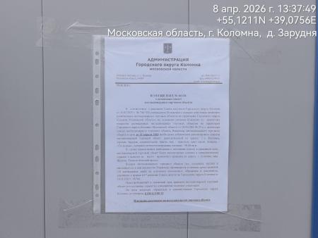 Извещение № 162/26 о демонтаже (сносе) НТО по адресу: Г.о. Коломна, деревня Зарудня, специализация: Промтовары, вид – павильон, цвет–серый, вывеска – отсутствует, материал-металлоконструкция, площадь - 50,00 кв.м.