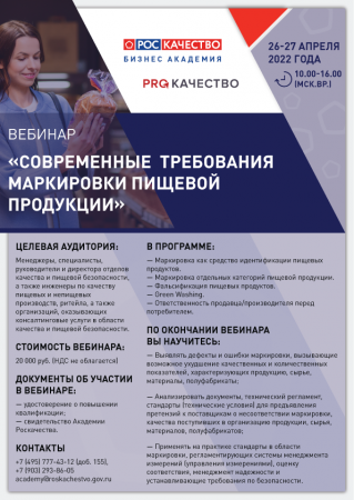 Проведение 26-27 апреля 2022 года вебинара "Современные требования маркировки пищевой продукции"