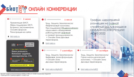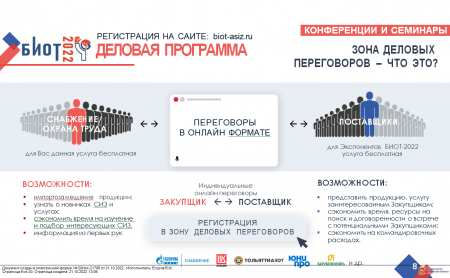 25-я юбилейная Международная специализированная выставка "Безопасность и охрана труда" (БИОТ-21)30 июнь 202125-я юбилейная Международная специализированная выставка "Безопасность и охрана труда" (БИОТ-21)07 апрель 2021Онлайн конференцию «Новая реальность. Изменение трудового законодательства. ЕТН. Кому и какие СИЗ необходимы. Обучение применению СИЗ»02 июнь 2022III Новосибирский Торговый Форум29 ноябрь 2021ВЫСТАВКА ИНДУСТРИИ ЧИСТОТЫ CLEANEXPO MOSCOW 202214 октябрь 2022