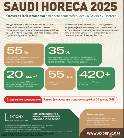 Международная выставка "SAUDI HORECA 2025" (https://www.saudihoreca.com/Riyadh/EN/index.html), важнейшее событие гостиничного и ресторанного бизнеса региона MENA, пройдет с 15 по 17 декабря 2025 в Королевстве Саудовская Аравия (г. Эр-Рияд).