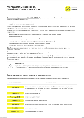 Министерство сельского хозяйства и продовольствия Московской области информирует о том, что согласно Постановлению Правительства РФ от 21.11.2023 № 1944 и Постановлению Правительства РФ от 03.03.2023 № 257, все участники товарооборота товарной группы "вода" должны установить бесплатное программное обеспечение "Локальный модуль "Честный знак" (далее - ПО ЛМ ЧЗ). которое позволяет проверять маркированные товары в онлайн- и офлайн-режиме без интернета, используя локальную базу данных, автоматически обновляющуюся при наличии интернет-соединения. Использование офлайн-проверок полностью исключает отклонения "Продажа без проверки кода маркировки".