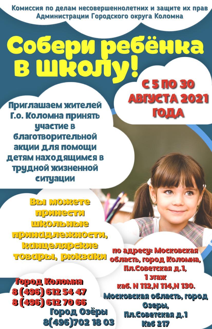 С 05 по 30 августа 2021 года вы можете принести школьные принадлежности: тетрадки, ручки, карандаши, обложки для тетрадей и книг, цветную бумагу, картон, краски, пластилин, линейки, ножницы, пеналы, альбомы для рисования, школьные рюкзаки в комиссию по делам несовершеннолетних и защите их прав по следующим адресам: г. Коломна, пл. Советская, д.1, каб.112, 114, 130, г. Озёры, пл. Советская, д.1, каб.217.