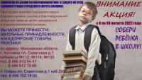 С 08 по 30 августа 2022 года вы можете принести школьные принадлежности: тетрадки, ручки, карандаши, обложки для тетрадей и книг, цветную бумагу, картон, краски, пластилин, линейки, ножницы, пеналы, альбомы для рисования, школьные рюкзаки в комиссию по делам несовершеннолетних и защите их прав по следующим адресам: