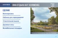«Работы по благоустройству затронули и пляж на реке Коломенка. Здесь появилась велопарковка, кабина для переодевания, вышка спасателей, душевые зоны, обновили волейбольные площадки, – рассказал Александр Владимирович. – Сейчас пляж работает в формате зоны отдыха. Мы проводим ремонт плотины на реке Коломенка. После завершения приступим к благоустройству еще одной зоны отдыха. Проект разработан на средства федерального гранта. Мы получили его, победив в конкурсе благоустройства малых городов и исторических поселений. Он проводится с 2018 года по инициативе нашего президента Владимира Владимировича Путина. Вся концепция разрабатывалась на основе пожеланий жителей».