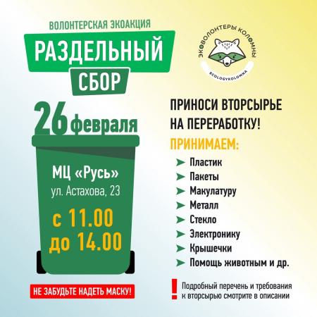 В субботу, 26 февраля, с 11:00 до 14:00 у Молодёжного центра «Русь» пройдёт акция по раздельному сбору вторсырья.