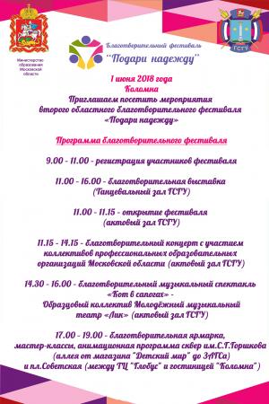 1 июня 2018 года приглашаем посетить вас мероприятия второго областного благотворительного фестиваля«Подари надежду»Ctrl