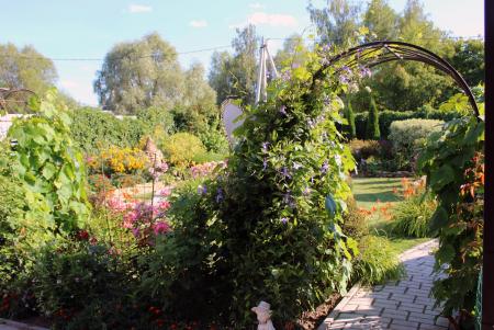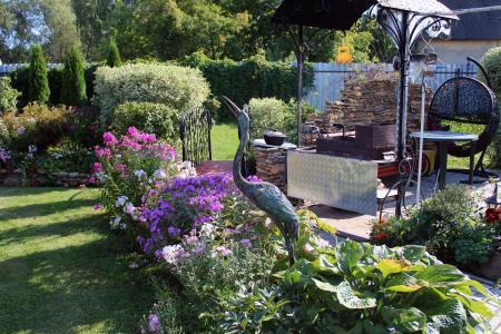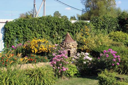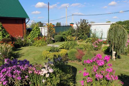 Лилейник, хризантемы, ромашки, флоксы, розы, октябрины, хосты, бархотки, астры, гортензии, спирея, можжевельник – и это ещё не полный перечень растений, с любовью выращенных хозяйкой дома.
