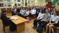 Ответственный в благочинии города Коломны за религиозное образование и катехизацию, клирик Троицкого храма в Щурово, член Общественной палаты городского округа Коломна Комиссии по культуре, сохранению исторического наследия, туризму, межнациональным и межконфессиональным отношениям священник Петр Галанюк в формате открытого диалога отвечал на вопросы старшеклассников.