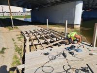 На данный момент подрядчик проводит работы по устройству пирсов и деревянного настила, монтажу малых архитектурных форм и высадке прибрежной растительности. Также на территории устанавливают опоры освещения и камеры видеонаблюдения.