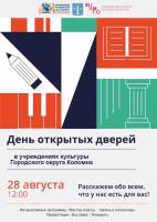 28 августа в 12.00 во всех учреждениях культуры Коломны и Озер пройдет День открытых дверей. На большой творческий праздник приглашаются все желающие.