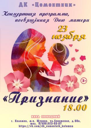 23 ноября в 18.00 состоится праздничный концерт коллективов ДК «Цементник», посвященный Международному дню матери. Это праздник, к которому никто не может остаться равнодушным. С особой нежностью и признательностью в этот день мы будем говорить слова благодарности всем матерям, которые дарят детям заботу, любовь, добро, нежность и ласку.