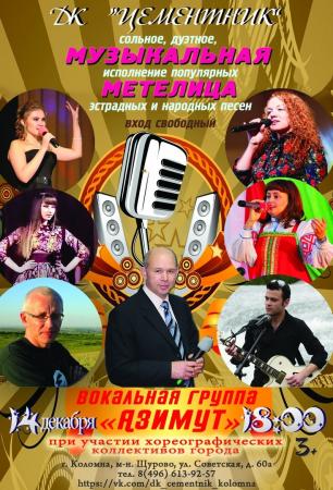14 декабря в 18:00 на сцене Дворца культуры «Цементник» пройдет концертная программа вокальной группы «Азимут» «Музыкальная метелица 2018» (руководитель Константин Дмитриевич Киселев).