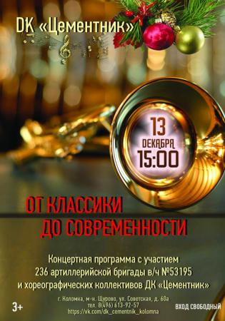13 декабря в 15.00 на сцене Дворца культуры "Цементник" пройдет концерт духовой музыки оркестра 236 артиллерийской бригады под руководством военного дирижёра лейтенанта Игнатова Никиты Сергеевича «От классики до современности».