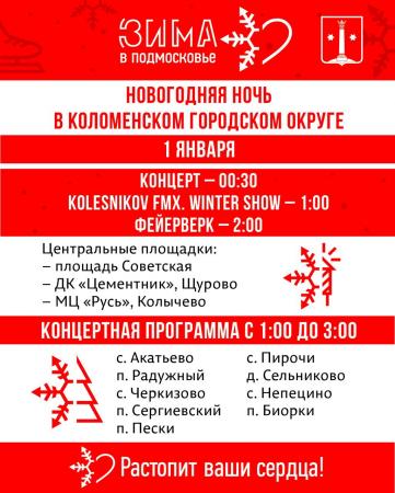 В Коломенском городском округе новогодняя ночь пройдет на нескольких площадках. Главными станут площадь Советская, ДК «Цементник» в Щурово, МЦ «Русь» в Колычево. На них для гостей и жителей города пройдут праздничные концерты, а кульминацией праздника станет фейерверк.