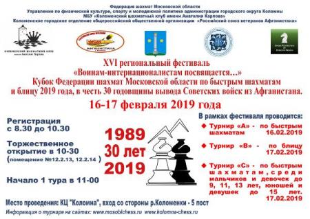 16-й региональный шахматный фестиваль «Воинам-интернационалистам посвящается…» состоится в «Конькобежном центре «Коломна» 16-17 февраля 2019 г.