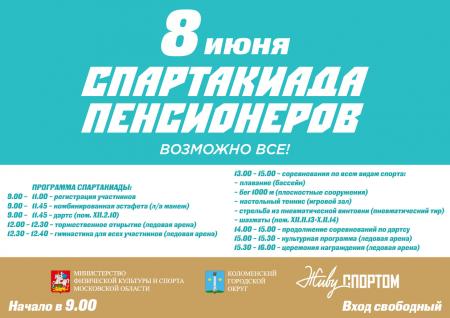 Региональный этап Спартакиады пенсионеров состоится на спортивных площадках Конькобежного центра «Коломна» 8 июня. В соревнованиях примут участие более 400 представителей всех муниципальных образований Московской области.