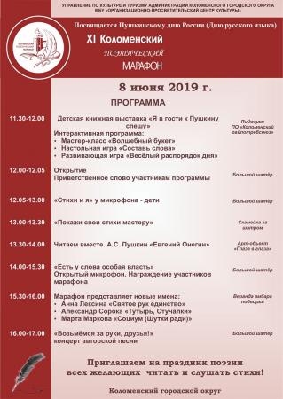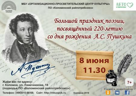 8 июня в 11.30 на подворье ПО «Коломенский райпотребсоюз» (ул. Лажечникова, д. 18) состоится программа «Большой праздник поэзии, посвящённый 220-летию со дня рождения А.С. Пушкина», куда приглашают всех любителей поэтического слова.